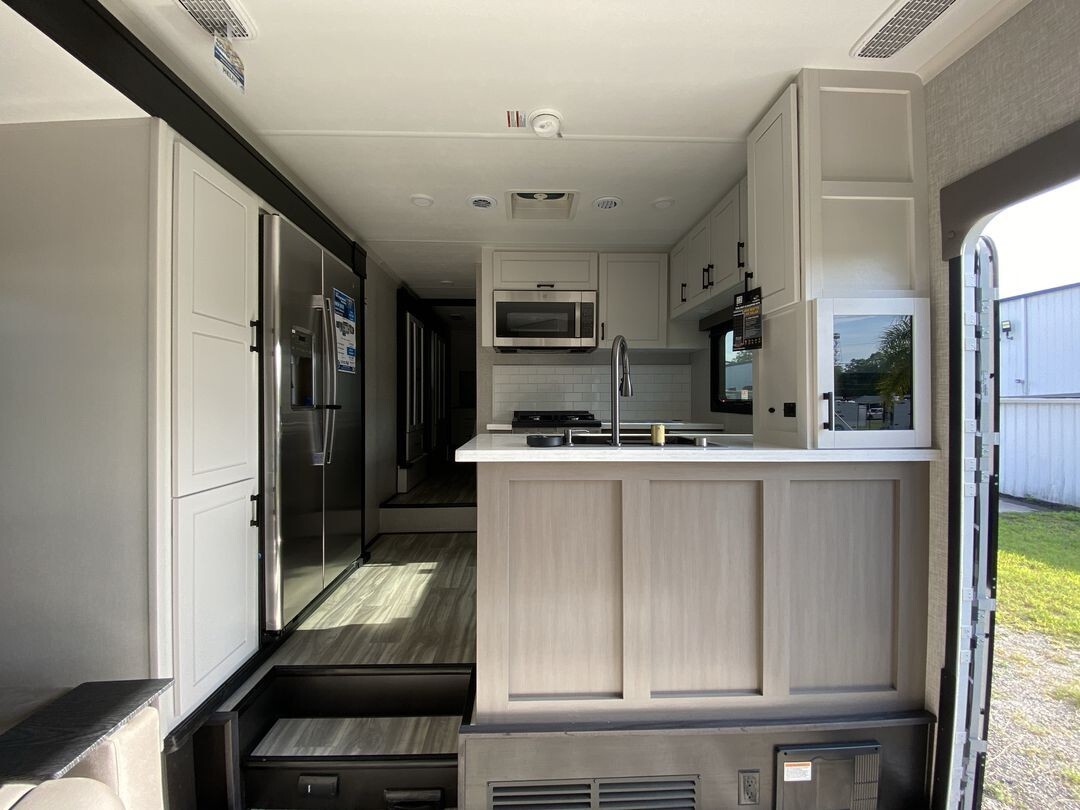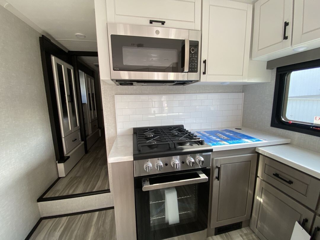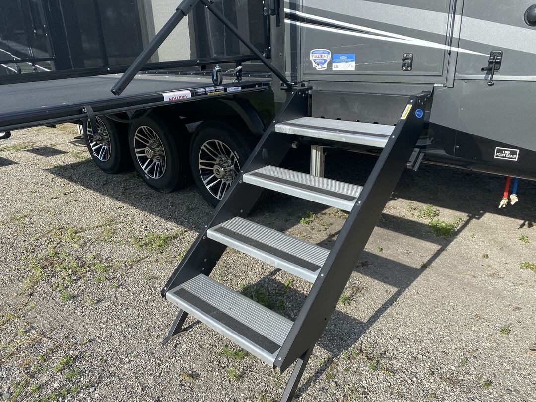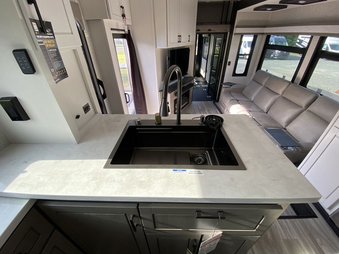 The 2024 Jayco Seismic Luxury 4113 is a premium toy hauler fifth wheel that combines comfort and practicality for travelers who enjoy bringing along their recreational gear. This model features a spacious 12.5-foot garage, providing ample room for ATVs, motorcycles, or other equipment. The garage area is versatile, easily converting into additional sleeping quarters or a lounge space, making it ideal for families or groups.Inside, the 4113 offers a welcoming living area with comfortable seating, including a large sofa and recliners, perfect for relaxing after a day of adventure. The kitchen is equipped with stainless steel appliances, a residential-sized refrigerator, microwave, and plenty of storage, allowing for convenient meal preparation on the go.The master bedroom features a king-sized bed with quality bedding and ample storage, providing a restful retreat. Dual air conditioning units ensure a comfortable interior