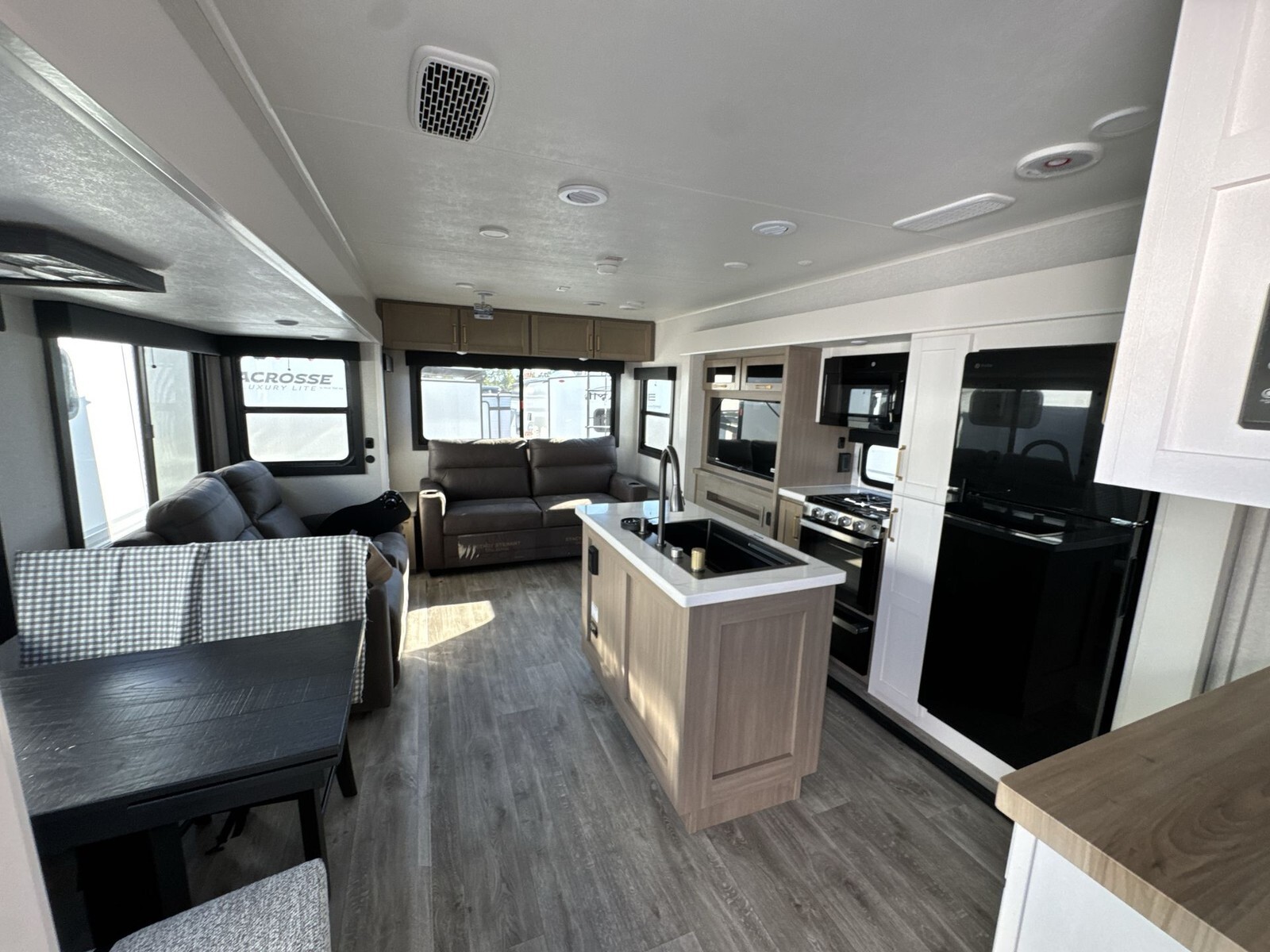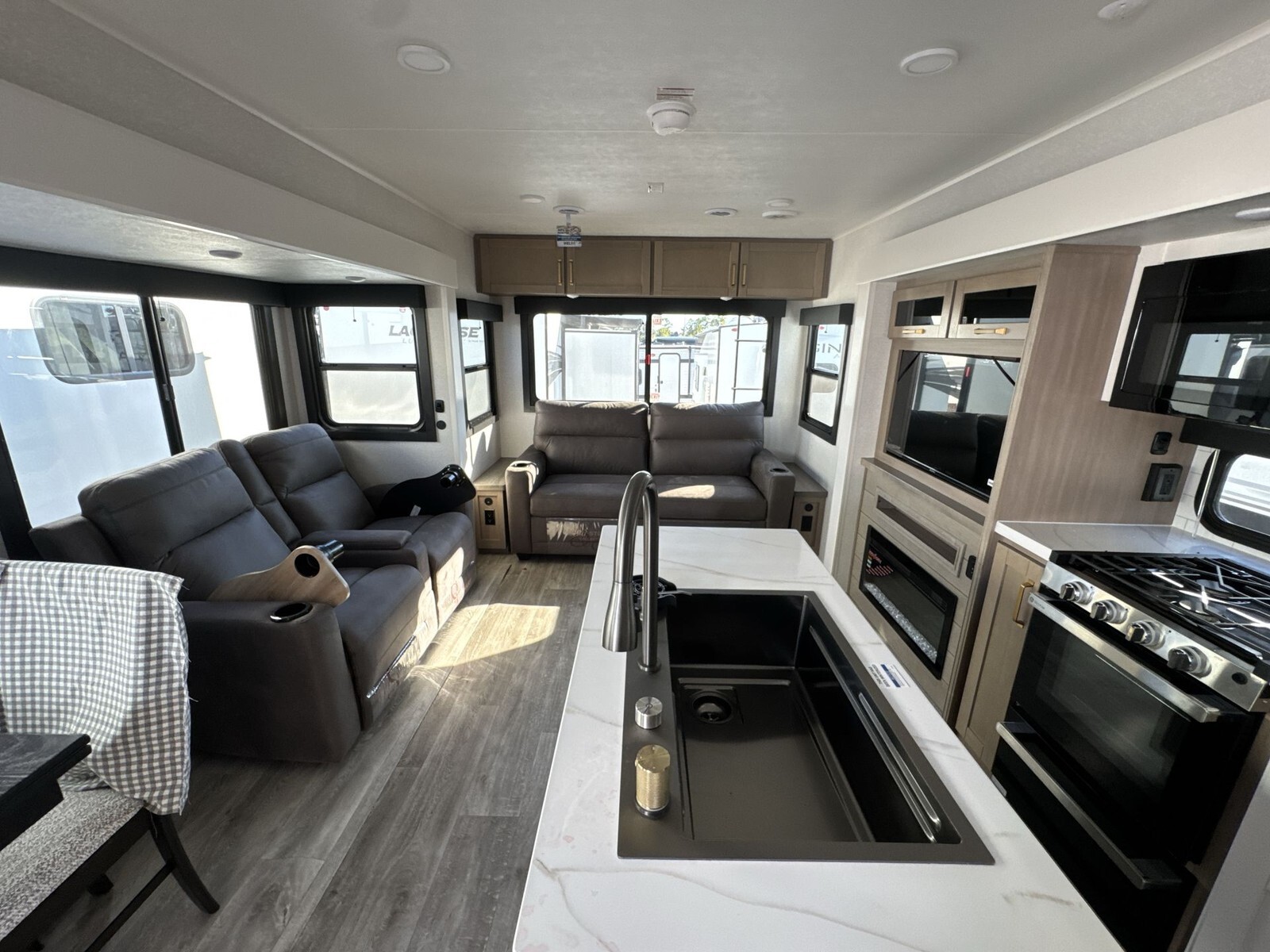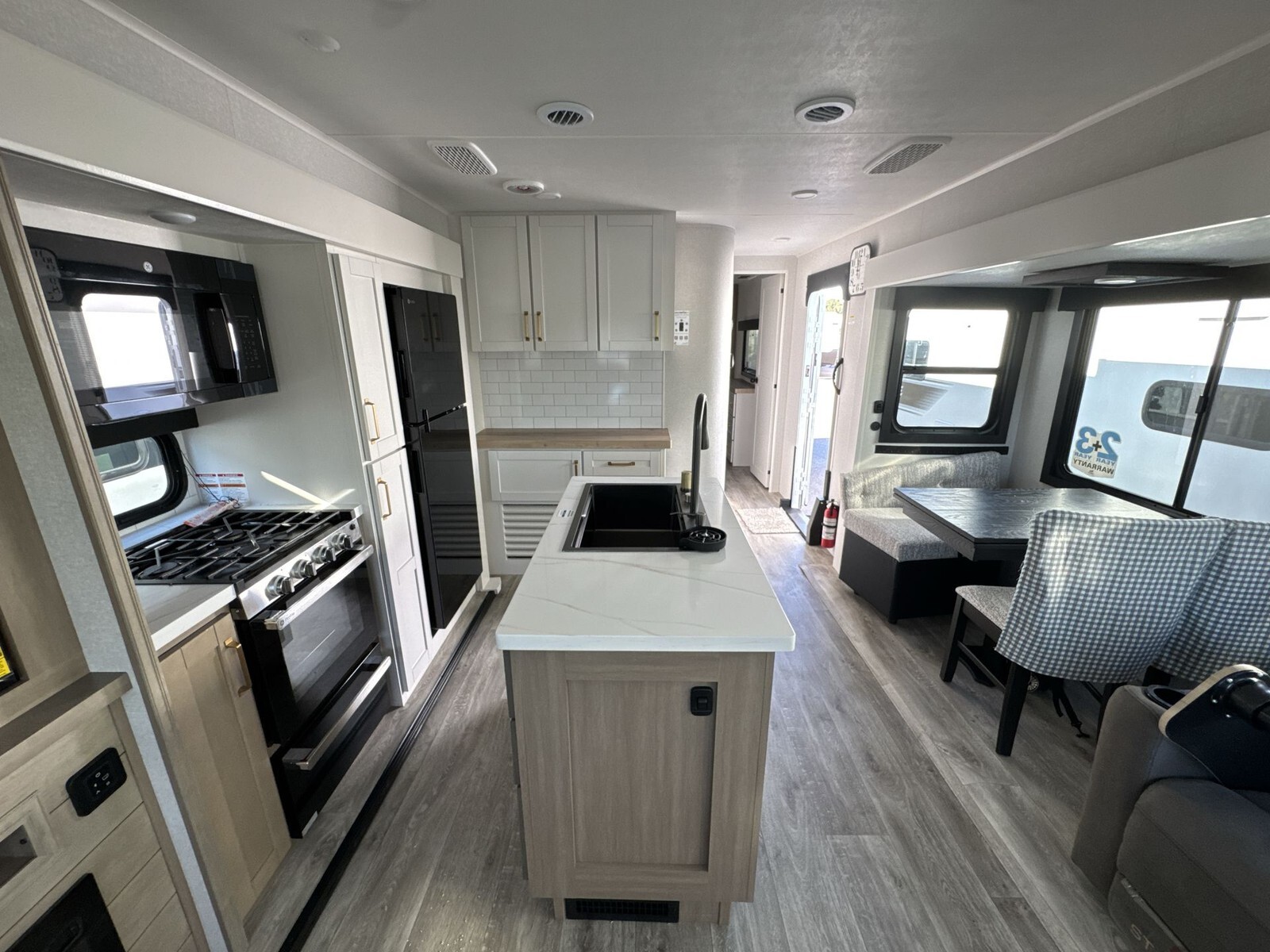 The exterior features a durable aluminum frame with fiberglass sidewalls, ensuring longevity and ease of maintenance. Equipped with a 14-foot power-retractable awning, it provides a shaded outdoor area for relaxation. The trailer's three slideouts expand the living space, enhancing the overall comfort during your travels.