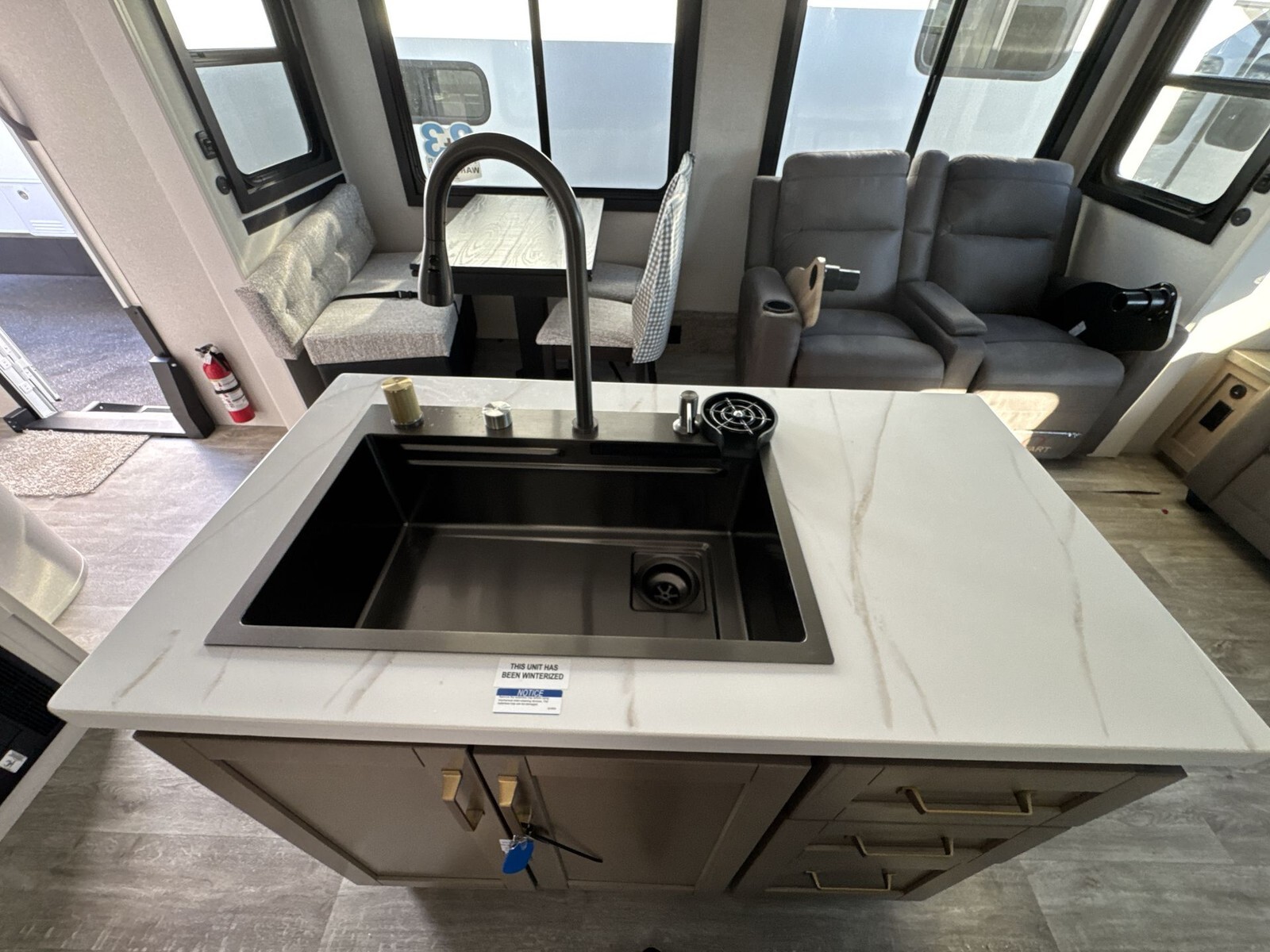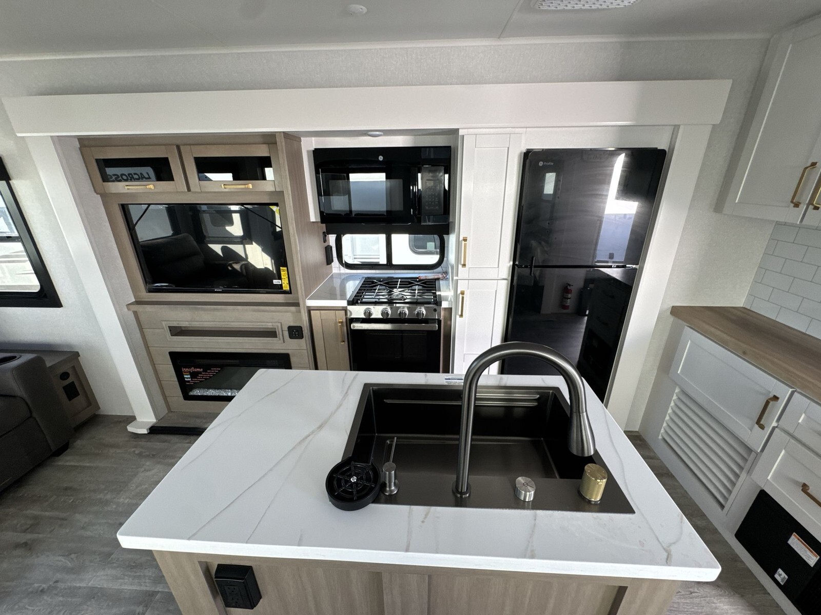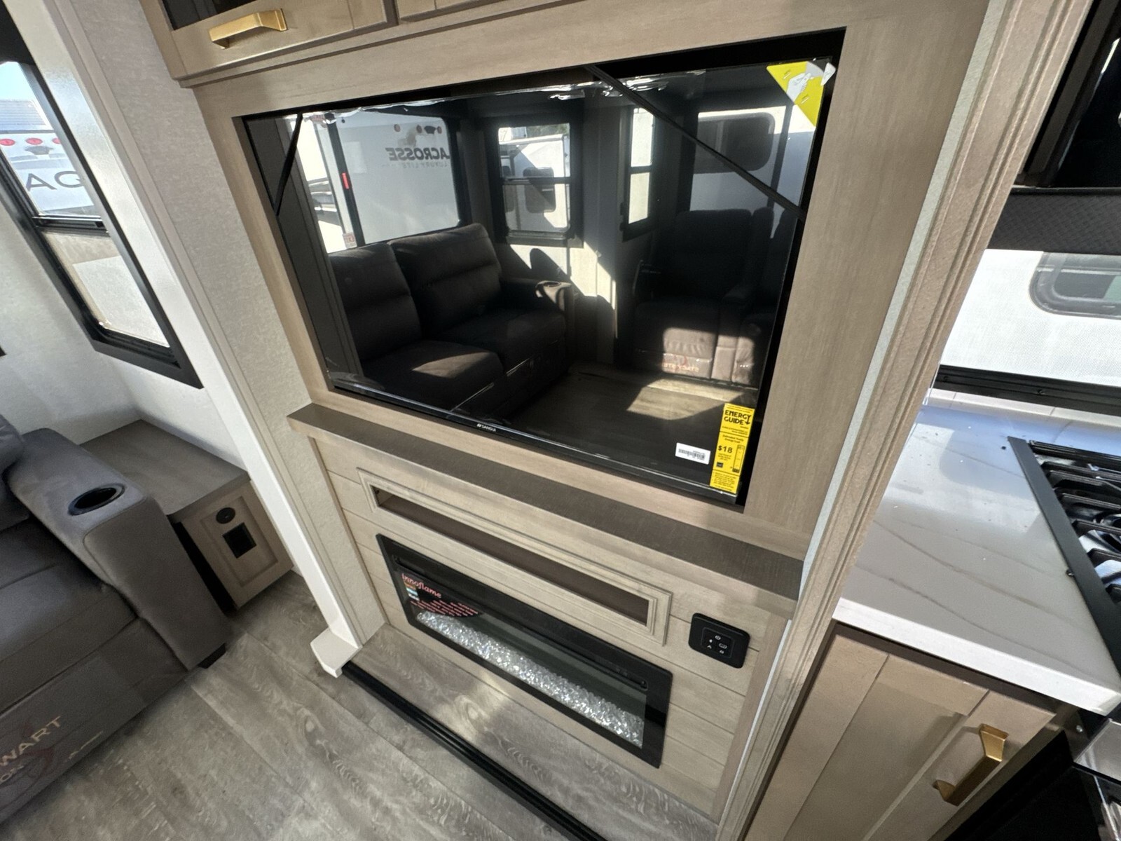 The exterior features a durable aluminum frame with fiberglass sidewalls, ensuring longevity and ease of maintenance. Equipped with a 14-foot power-retractable awning, it provides a shaded outdoor area for relaxation. The trailer's three slideouts expand the living space, enhancing the overall comfort during your travels.