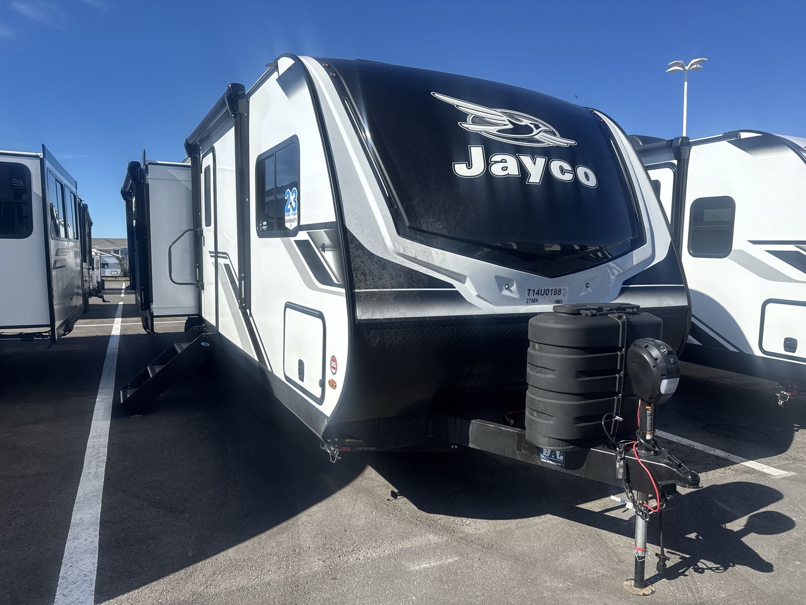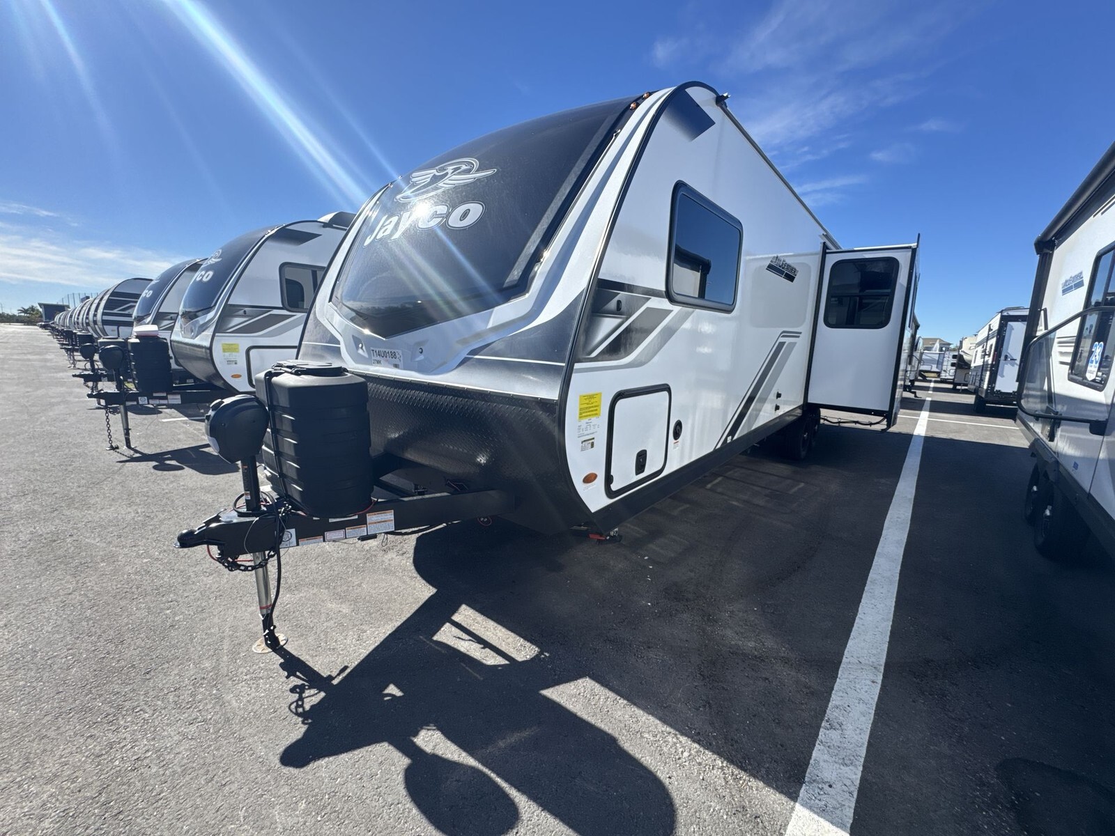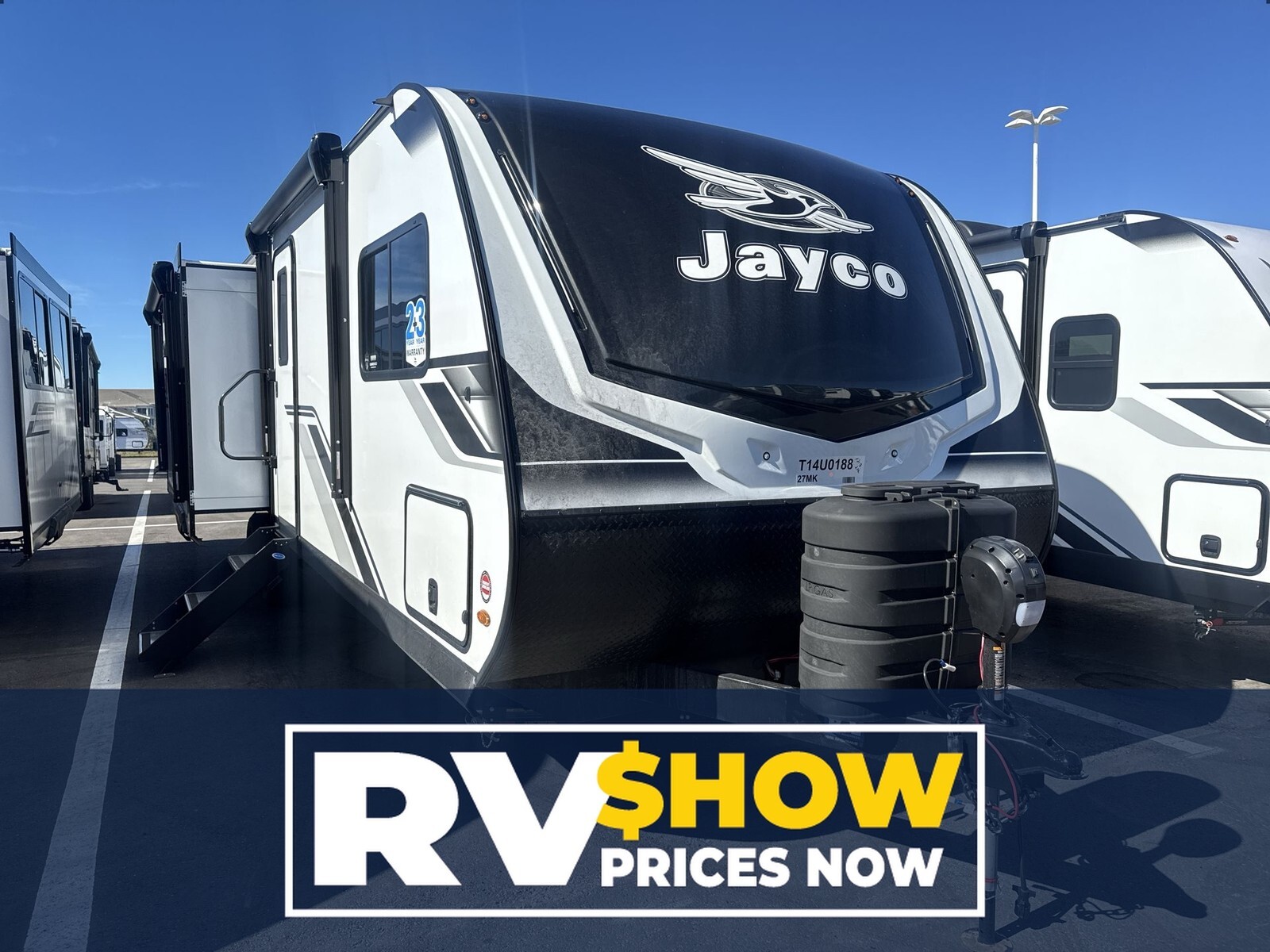 The 2025 Jayco Jay Feather 27MK is a travel trailer designed to provide comfort and functionality for your adventures. Built with a lightweight aluminum frame and an aerodynamic profile, it offers easy towing and improved fuel efficiency. The exterior features a power awning with LED lighting, creating a welcoming outdoor space for relaxation. Solar prep and outdoor speakers are included, allowing you to enjoy off-grid experiences with your favorite music.