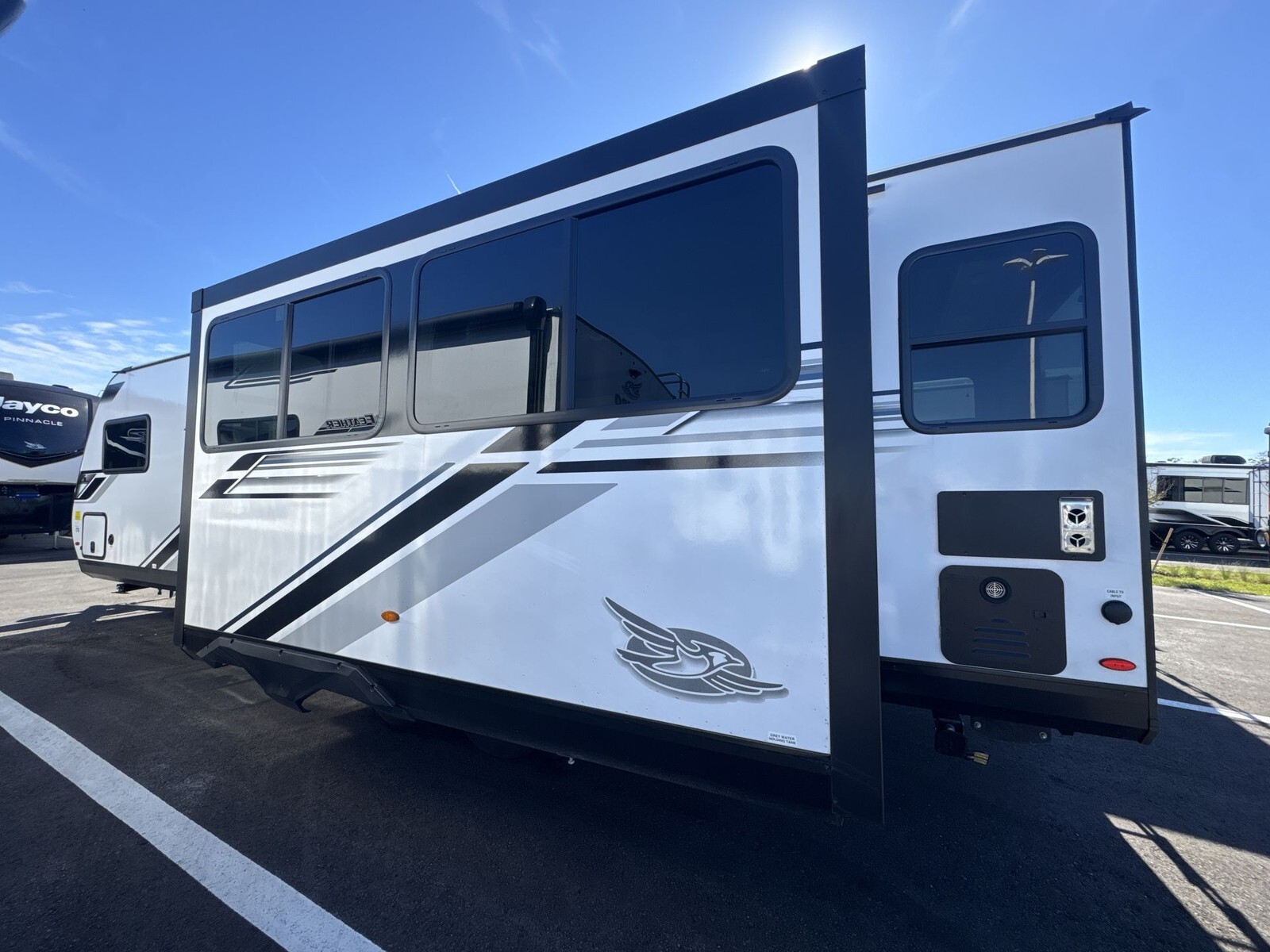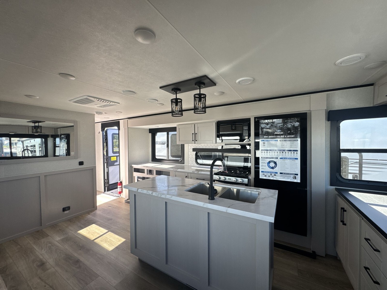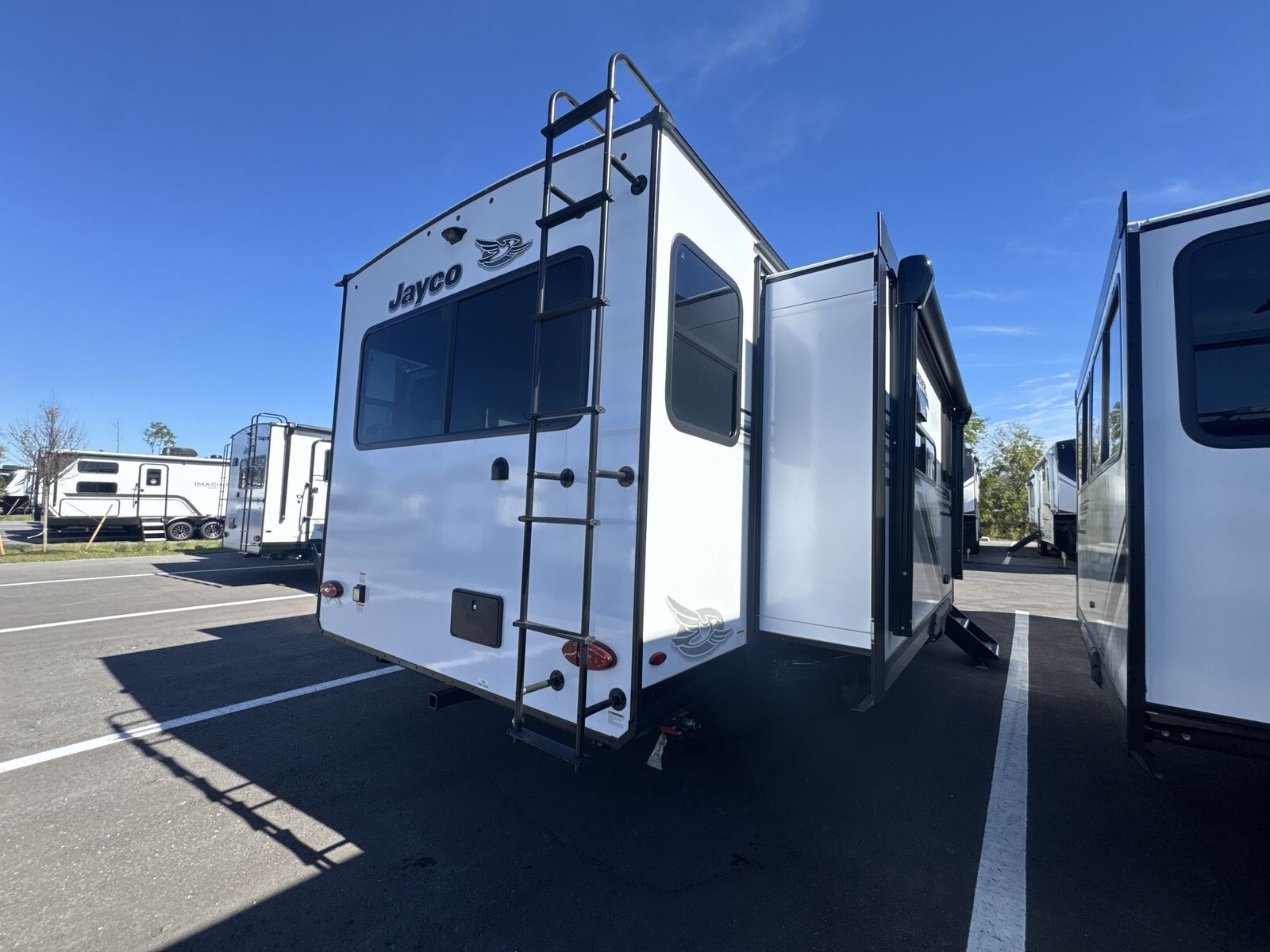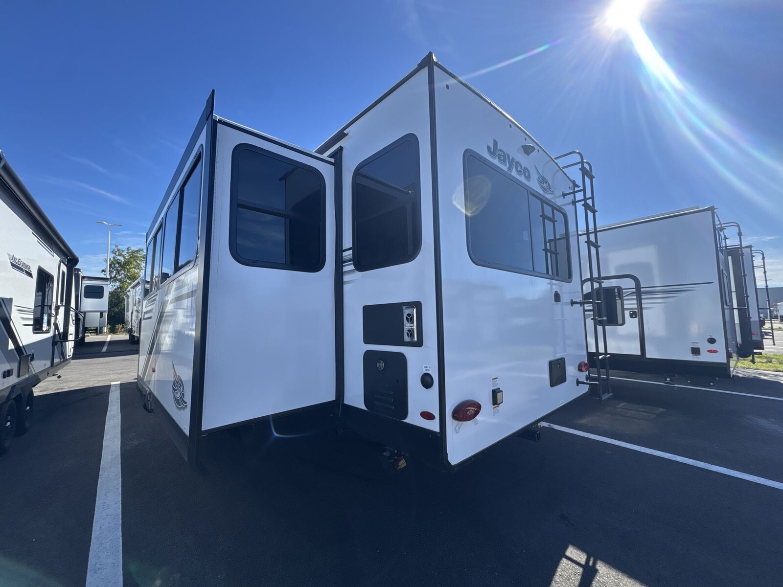 The 2025 Jayco Jay Feather 27MK is a travel trailer designed to provide comfort and functionality for your adventures. Built with a lightweight aluminum frame and an aerodynamic profile, it offers easy towing and improved fuel efficiency. The exterior features a power awning with LED lighting, creating a welcoming outdoor space for relaxation. Solar prep and outdoor speakers are included, allowing you to enjoy off-grid experiences with your favorite music.