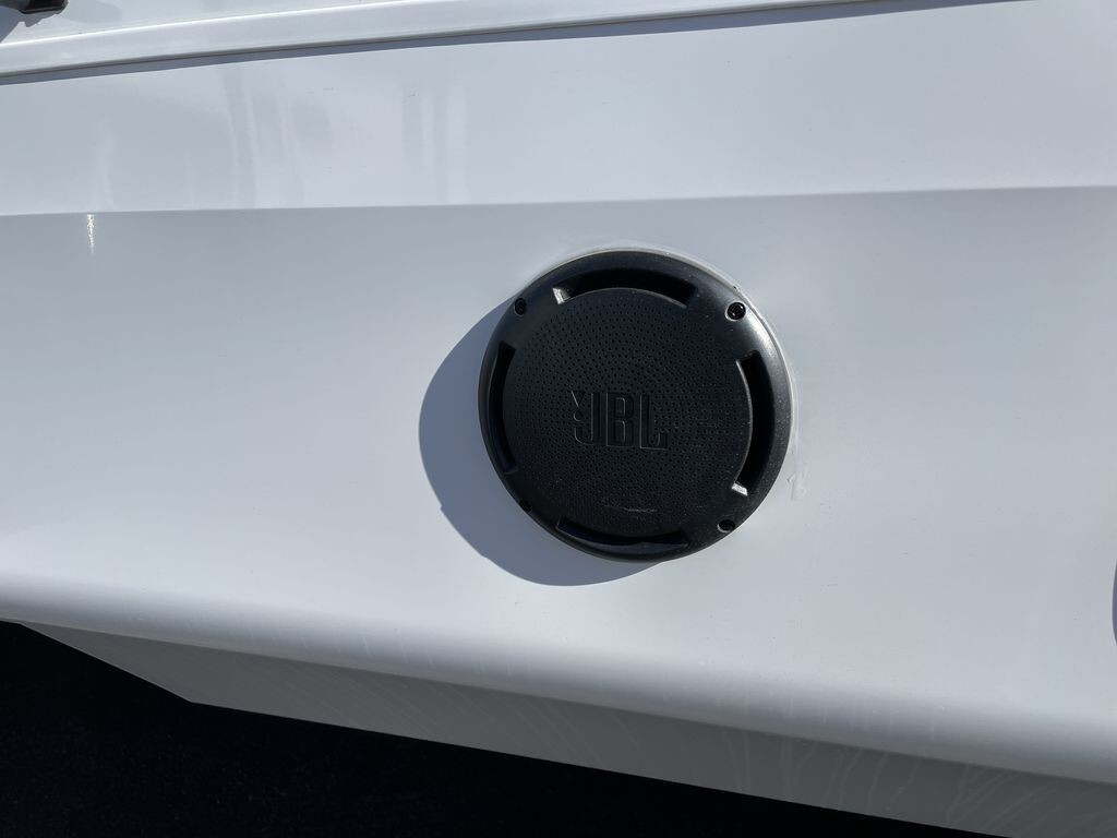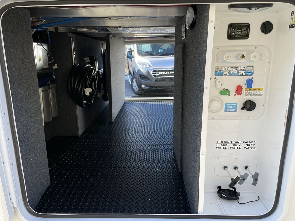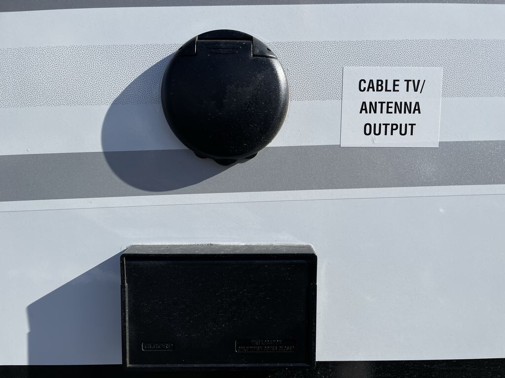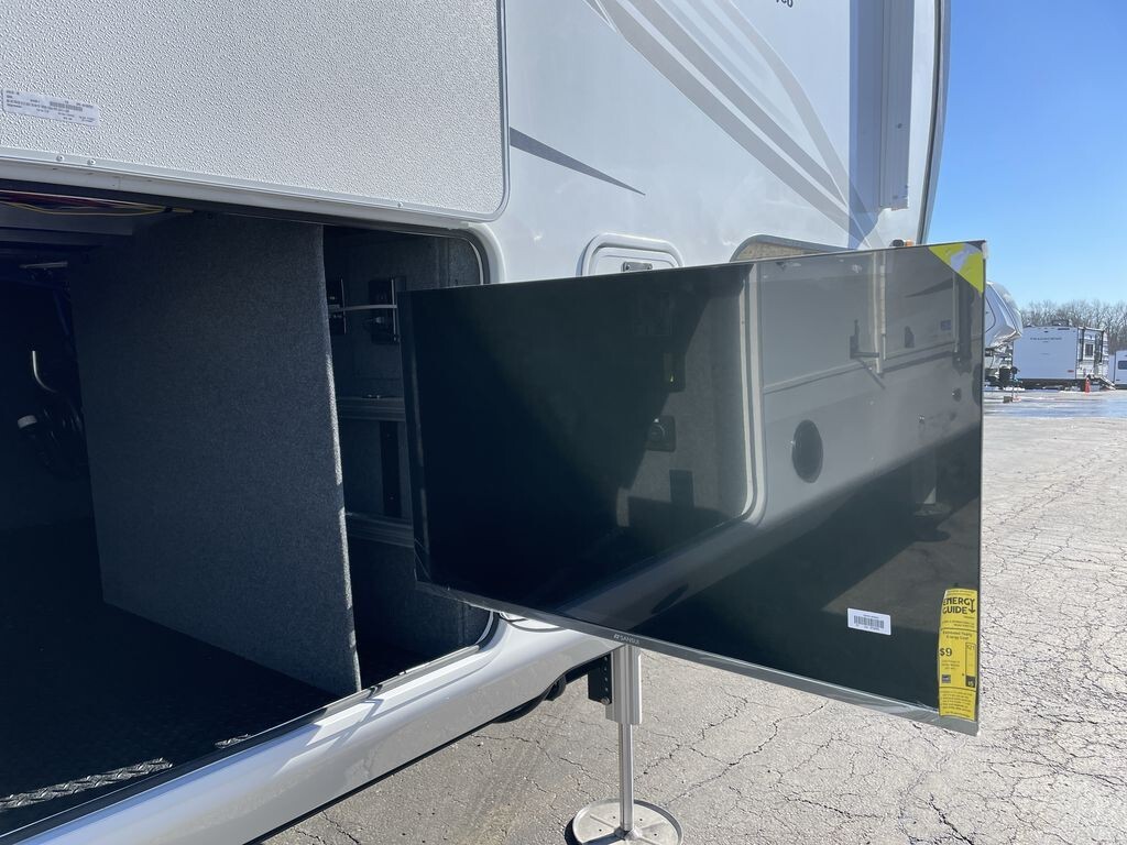 The exterior of the 381CKRE features a durable fiberglass construction, contributing to its longevity. A spacious awning extends over the entryway, offering a shaded area for outdoor activities.