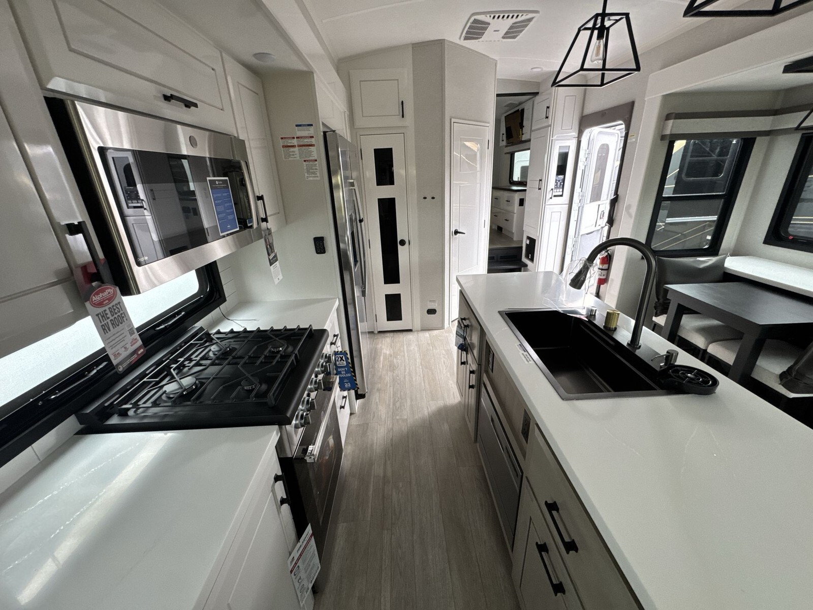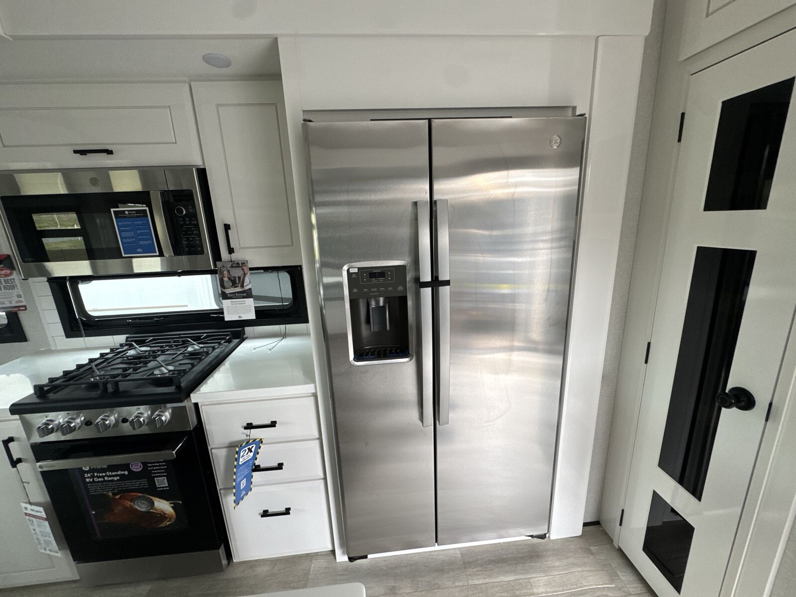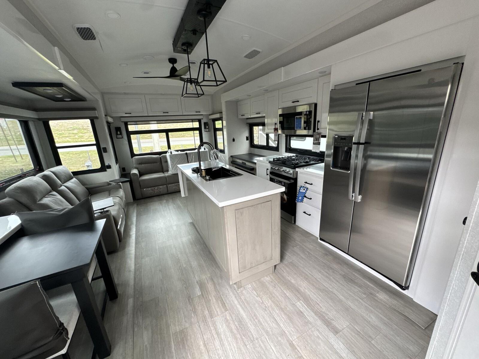 The kitchen is equipped with a residential-sized stainless steel refrigerator, a three-burner stove, and a convection microwave. Solid-surface countertops and abundant cabinetry offer plenty of room for meal preparation and storage. A large pantry adds to the practical storage solutions, making it easy to carry all the essentials for extended trips.