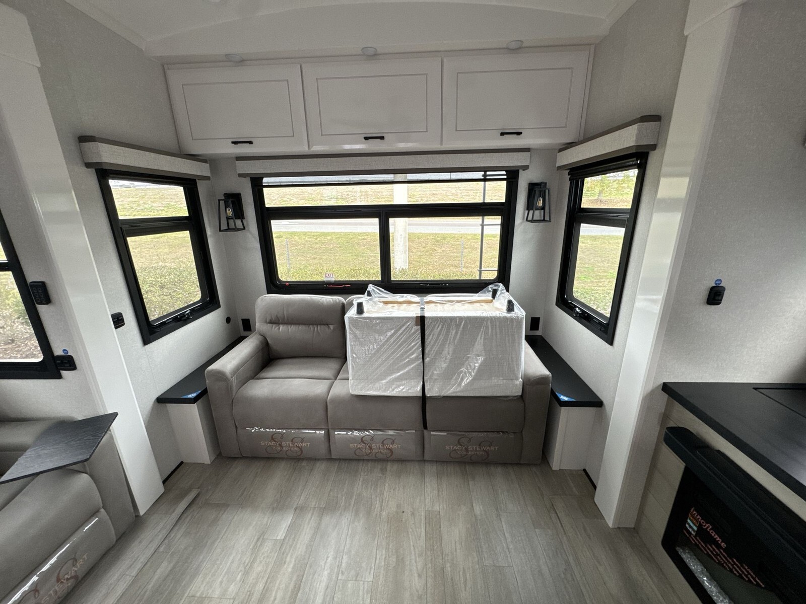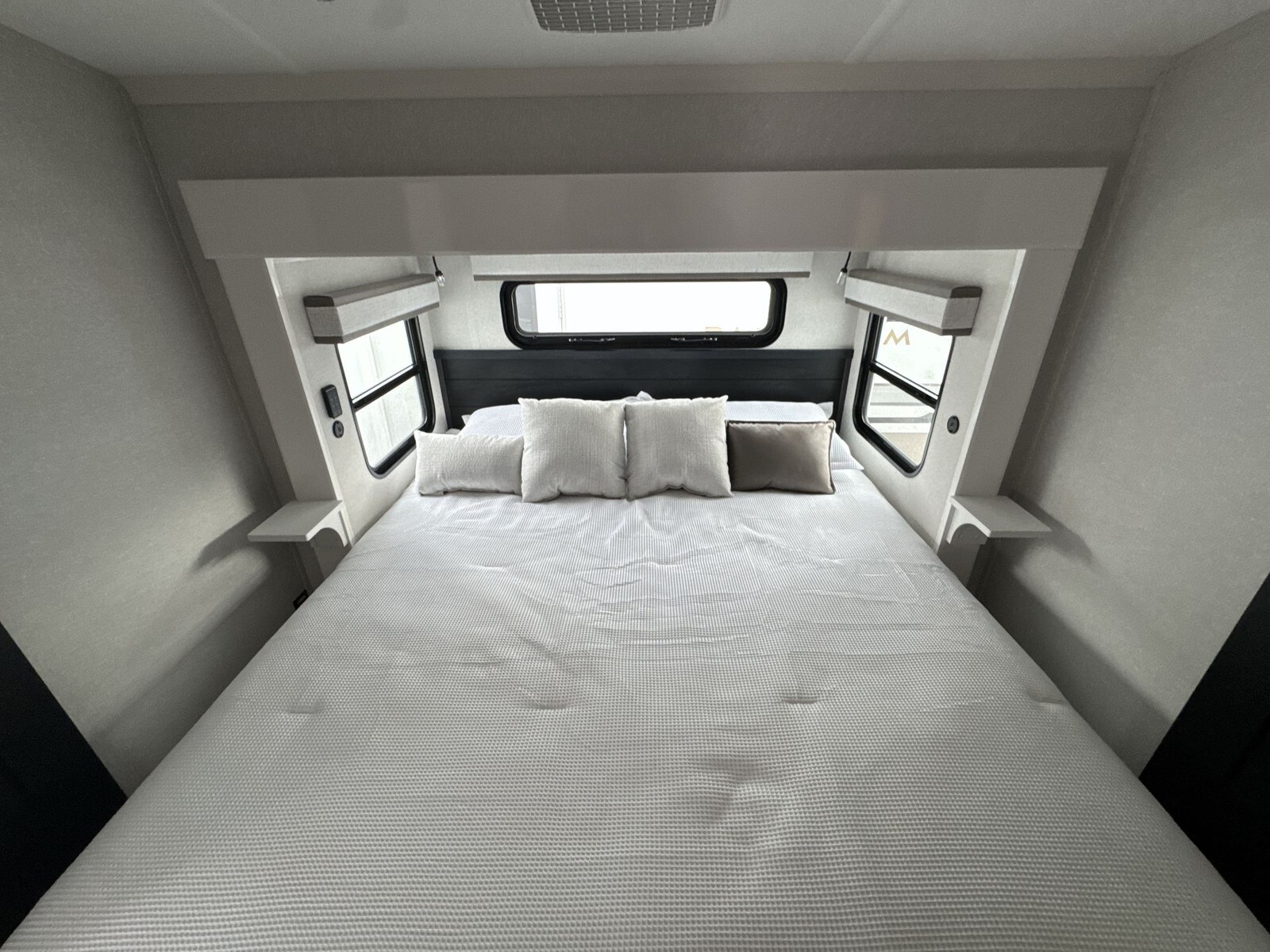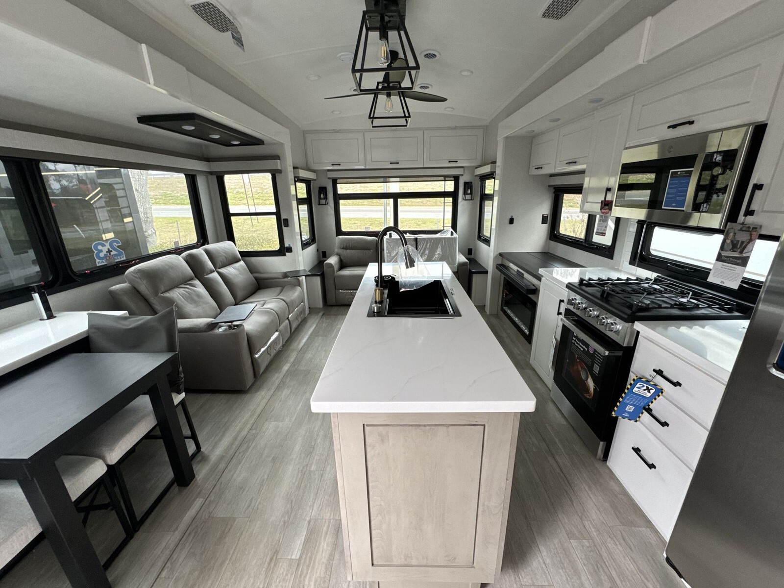 The kitchen is equipped with a residential-sized stainless steel refrigerator, a three-burner stove, and a convection microwave. Solid-surface countertops and abundant cabinetry offer plenty of room for meal preparation and storage. A large pantry adds to the practical storage solutions, making it easy to carry all the essentials for extended trips.