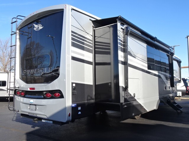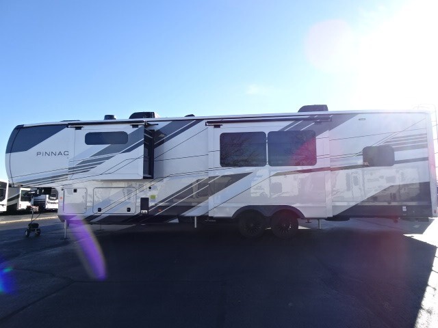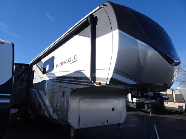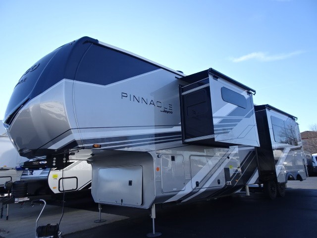 CLICK HERE FOR VIDEO TOURThe 2026 Jayco Pinnacle Luxury Fifth Wheel represents the height of RV craftsmanship, comfort and innovation. Designed for travelers who demand the very best, Pinnacle surrounds you with premium materials, residential-grade amenities and advanced technology—all thoughtfully integrated into a refined, road-ready package.Step inside and experience the Jayco difference. From handcrafted solid hardwood maple cabinetry to sleek solid-surface countertops, every detail reflects intentional design and superior build quality. GE’s premium kitchen suite includes a 21 cu. ft. residential refrigerator, a 30 in. convection microwave with built-in air fryer, and a 24 in. high-output range—along with an available built-in dishwasher and extended bar top for effortless entertaining.Relaxation reaches new heights with power theater seating that offers industry-first three-position headrests, heat, massage, power recline, LED lighting and integrated USB charging. Stain-resistant, cloth-covered cushions offer durability without sacrificing luxury. Climate control is seamless thanks to the HELIX Cooling System™ and ultra-efficient Whisper Quiet A/Cs.Technology and convenience are built into every corner. JAYCOMMAND® puts control of key systems at your fingertips, while the exclusive NuvoH2O Water Purification System delivers fresh, scale-free water at every faucet—ideal for both dry camping and full hook-up sites. With its salt-free citrus filtration, NuvoH2O helps protect plumbing and appliances while keeping your skin and water cleaner.Pinnacle also features the AquaLuxe package—a premium setup that includes a high-capacity tankless water heater, (3) 40-lb. propane bottles for extended use, and the NuvoH2O filtration system. Together, they deliver instant hot water, longer off-grid capability and consistently cleaner, better-tasting water throughout the coach.A 102-inch wide-body foundation, 120 lbs. of LP capacity, a 3,000 lb. rear tow hitch and massive pass-through storage with Slam-latch™ doors add real-world function to Pinnacle’s luxurious form. Backed by Stronghold VBL™ laminated walls and JaySMART™ safety lighting, it’s as durable and dependable as it is elegant.From weekend escapes to full-time adventures, the 2026 Pinnacle delivers a true residential experience—crafted to elevate every mile.
