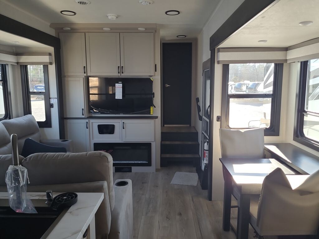 A standout feature of the 399 is its spacious garage area, measuring 13.5 feet in length. This space provides ample room to store adventure gear and can also serve as a versatile living area, offering additional sleeping quarters when needed. The ramp door facilitates easy loading and unloading of equipment.