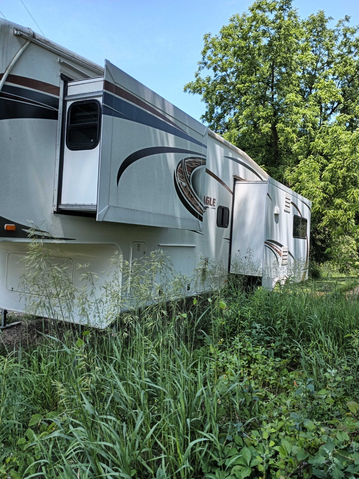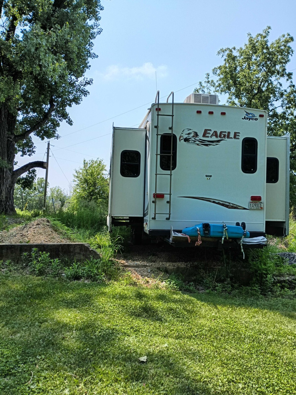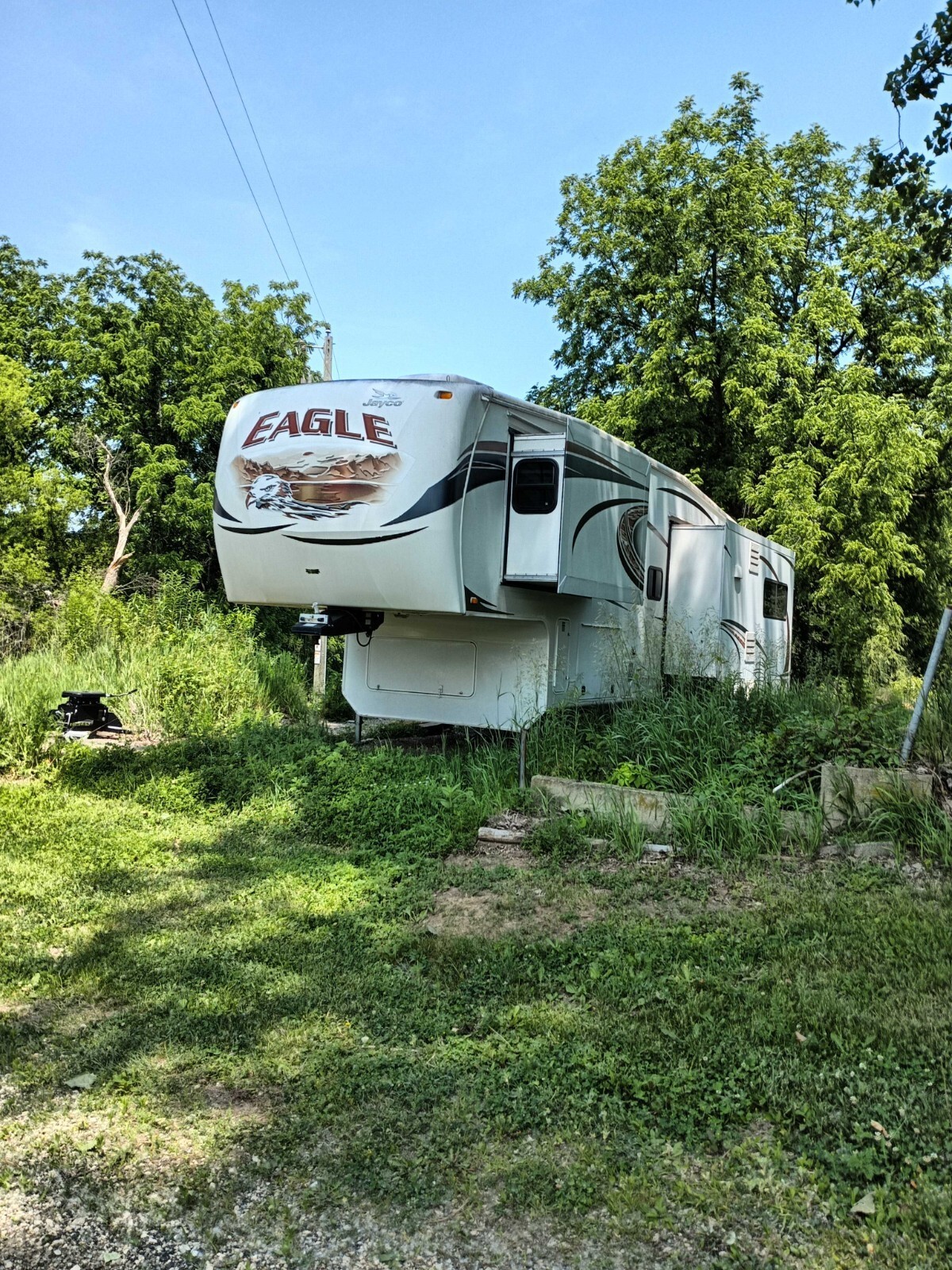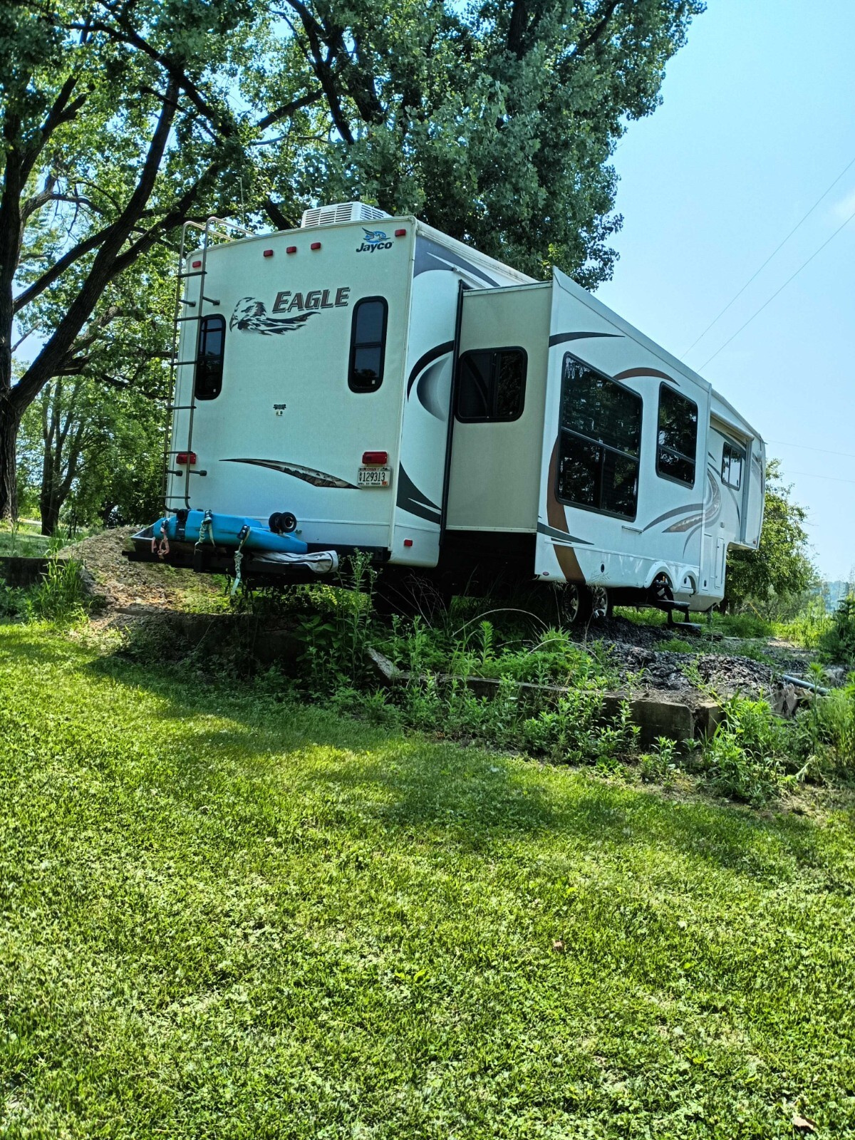 The product is a Jayco 35RLTS 5th wheel camper with a sleeping capacity for up to 4 people. It has a water capacity of 31-40 gallons and is equipped with 2 air conditioners and 3 slide outs for added space. The camper is 38 feet in length and includes 1 awning, leveling jacks, and is clean with a United States country of origin. Perfect for outdoor adventures and comfortable camping experiences.