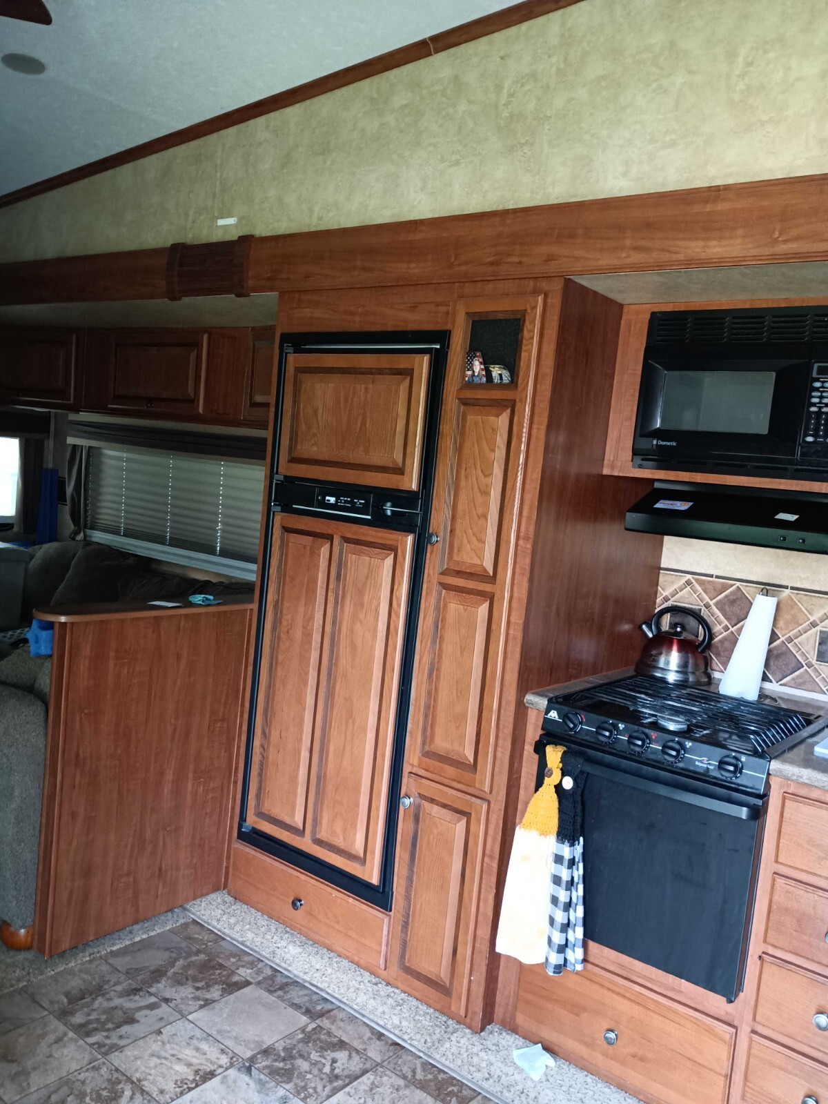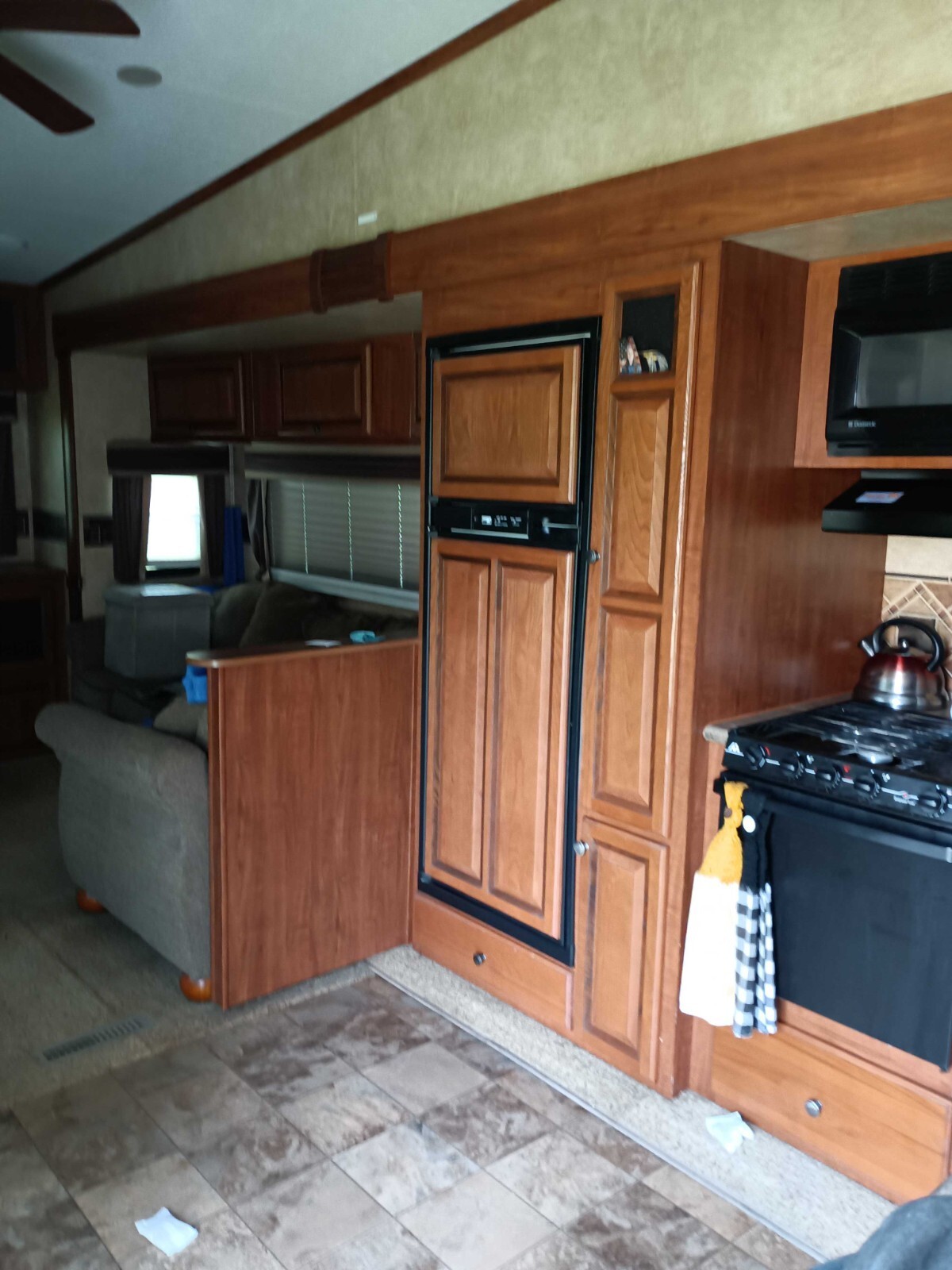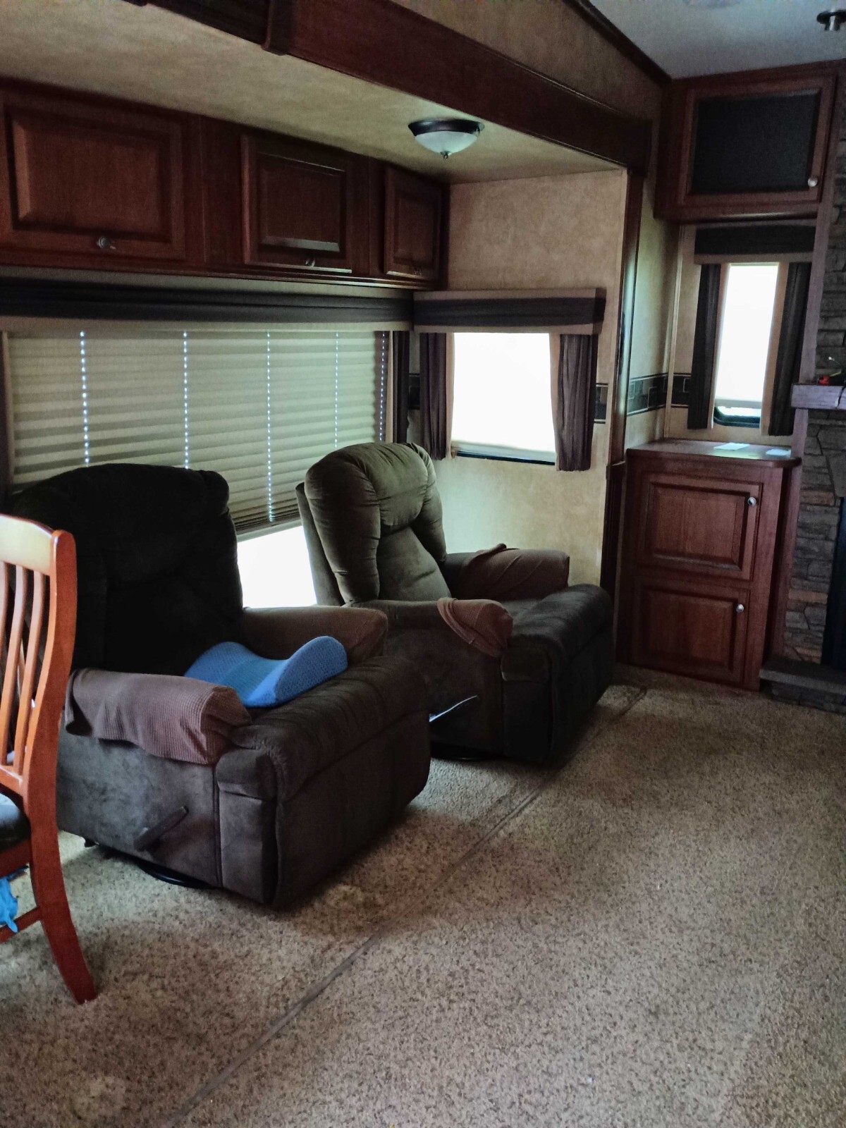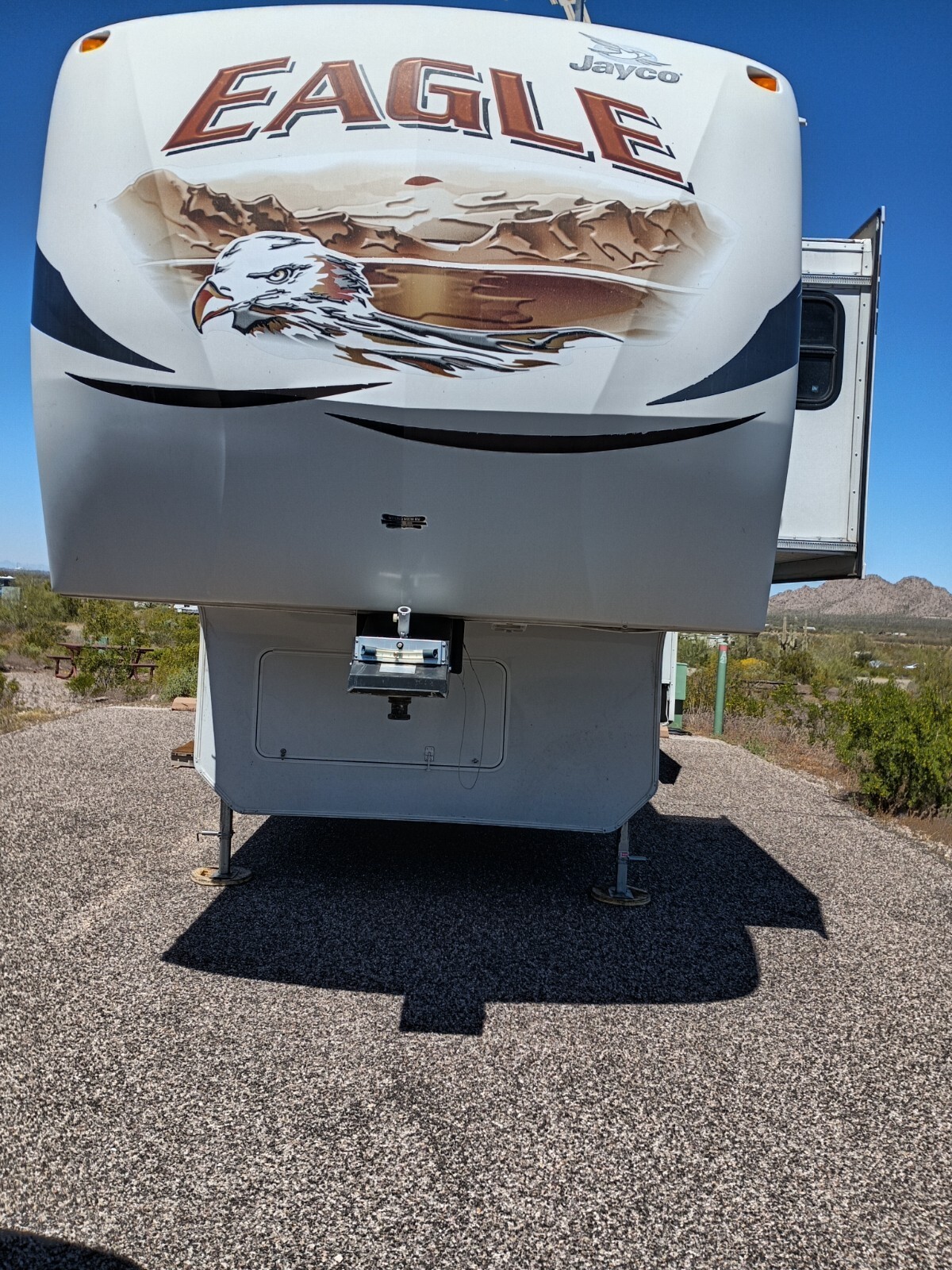 The product is a Jayco 35RLTS 5th wheel camper with a sleeping capacity for up to 4 people. It has a water capacity of 31-40 gallons and is equipped with 2 air conditioners and 3 slide outs for added space. The camper is 38 feet in length and includes 1 awning, leveling jacks, and is clean with a United States country of origin. Perfect for outdoor adventures and comfortable camping experiences.