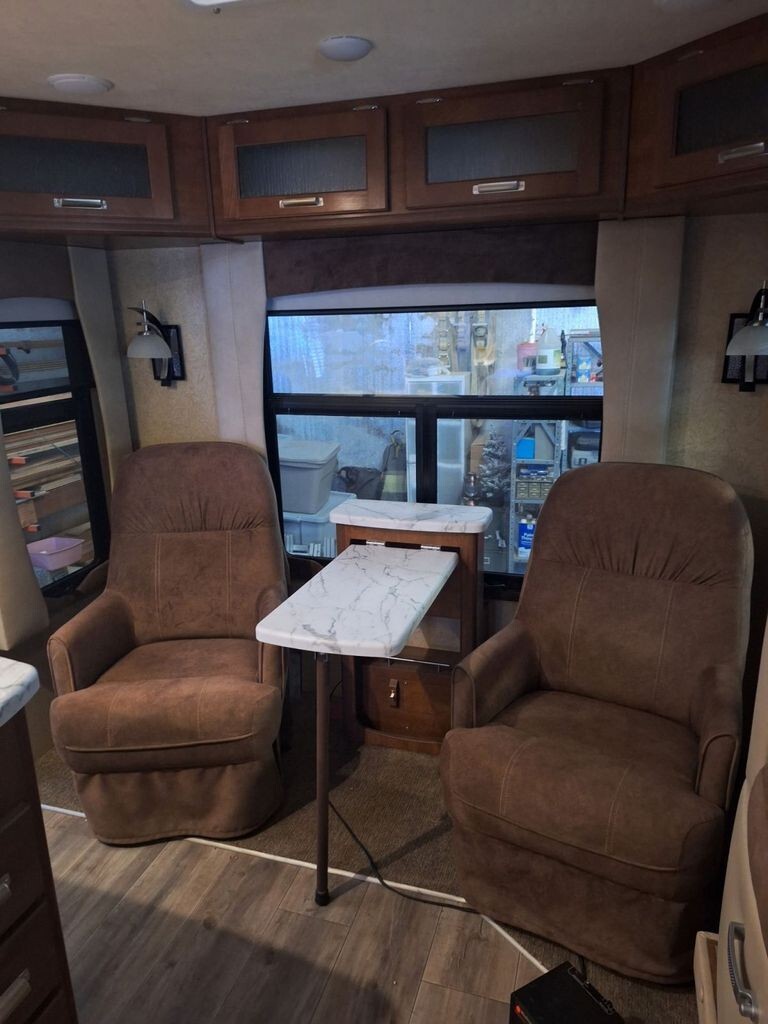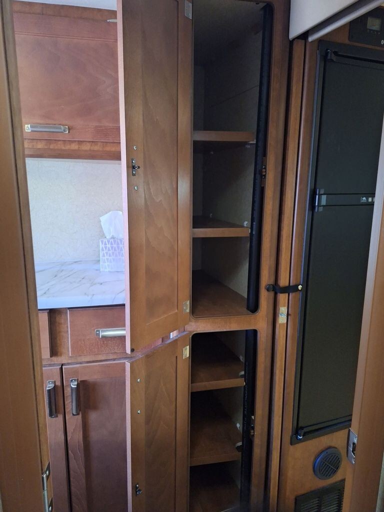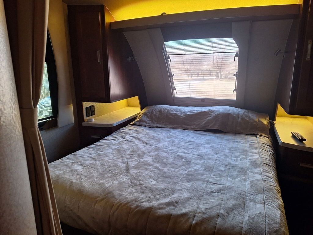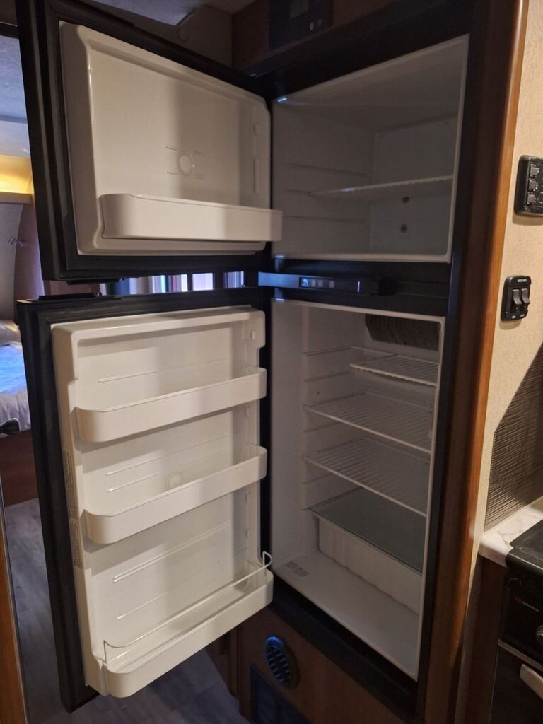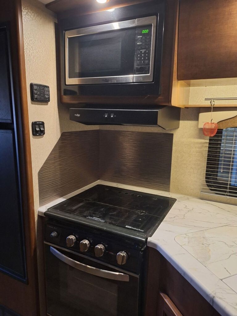 Up front, enjoy a true walk-around queen-size bed with ample storage, while the fully equipped kitchen gives you everything needed for life on the road. Youll find a 3-burner stove, oven, microwave, and generous prep spaceperfect whether you're cooking a quick meal or entertaining at camp.