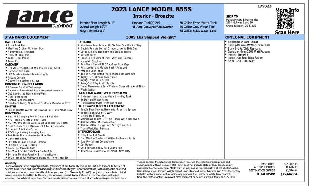 Adventure-ready and built with legendary quality, this 2023 Lance 855S truck camper is the perfect solution for travelers who want to explore without limits. Designed to fit both short and long bed trucks, this 18' camper delivers exceptional comfort, smart use of space, and Lances renowned construction, making it ideal for off-grid adventures, hunting trips, or extended stays in remote destinations.