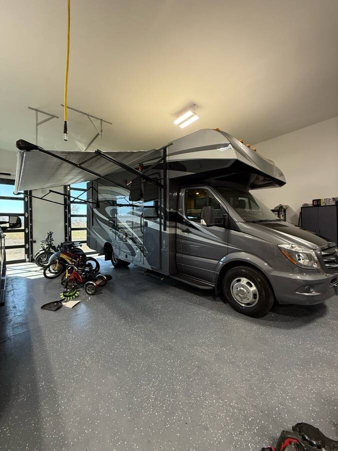 The 2017 Jayco Melbourne 24L is a 25'6" Class C motorhome built on a Mercedes-Benz Sprinter chassis with a diesel engine, typically achieving 13–18 mpg. It features one large slide-out, a queen-sized bed, and sleeps up to six people. Known for its compact size, it fits in most national parks, and it includes upscale features like a full-body paint finish, frameless windows, and JRidePlus suspension.