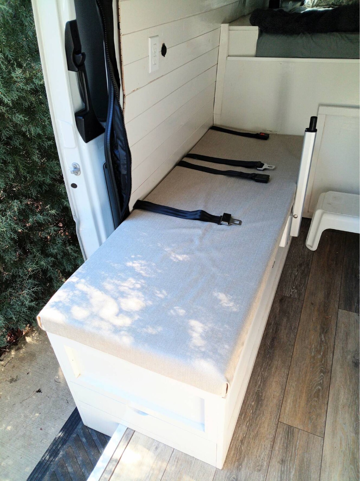 Sleeping:Queen size -Tempurpedic mattress -sleeps two plus one singleUnder storage with passenger bench seating for two. Additional sleeping space for 1 child