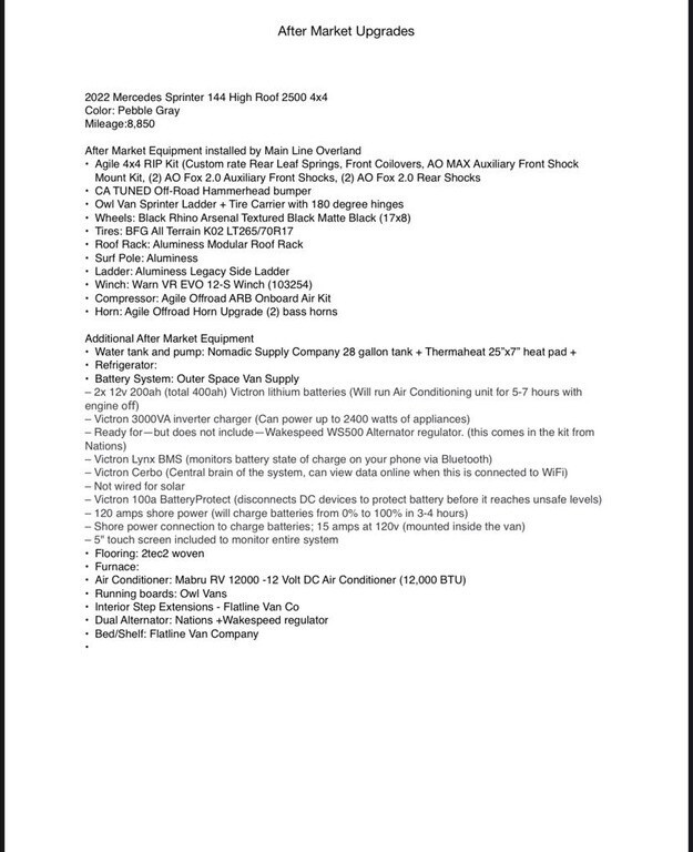 This RV is powered by a 3.0L Turbo Diesel engine and a 7G-TRONIC 7-speed automatic transmission with 12,900 miles. The overall length is 19.5 feet and it comes equipped with 1 A/C unit, a generator/solar panels, and plenty of room to sleep 2. This unit was converted by Main Line Overland (see photos for build sheets) and has been well-maintained.
