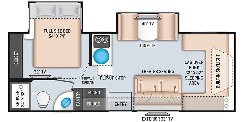 A versatile Class C RV with high-end décor and finishes—everything you need for life on the road, including a fully equipped kitchen, bathroom, living area, and sleeping areas. The floorplan features residential vinyl flooring that’s easy to clean and custom cabinetry with nickel-finish hardware with plenty of storage.