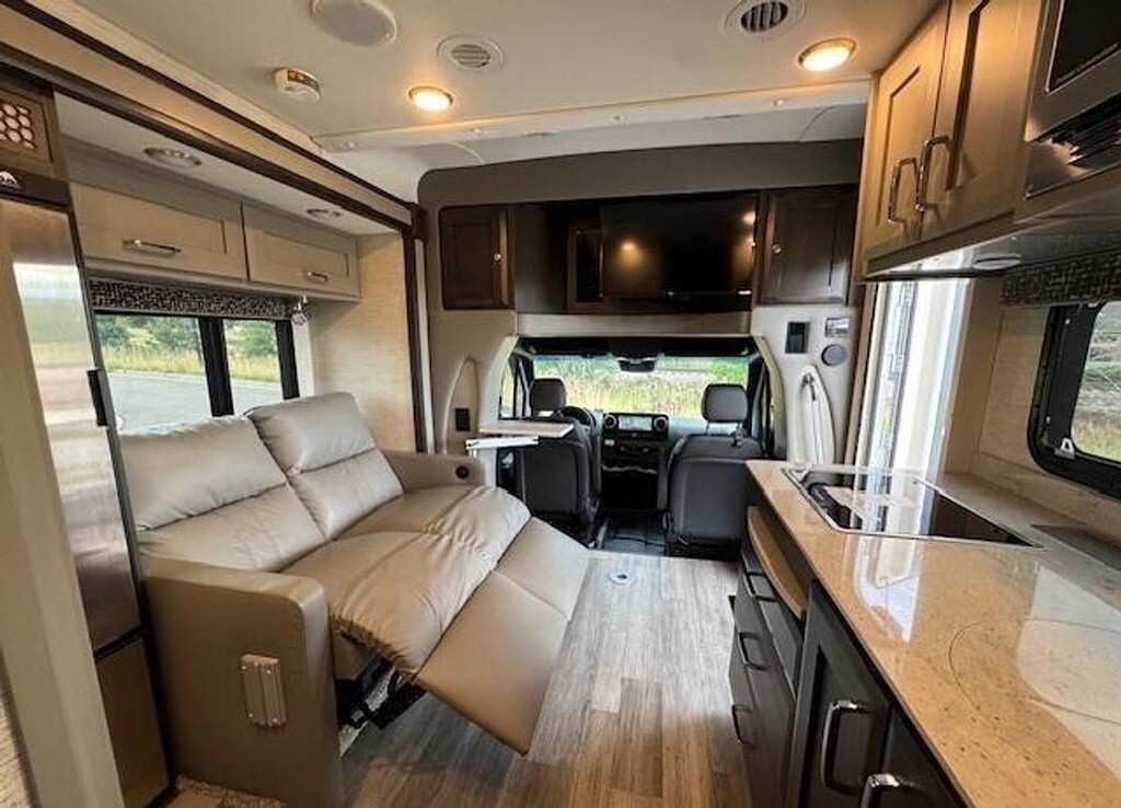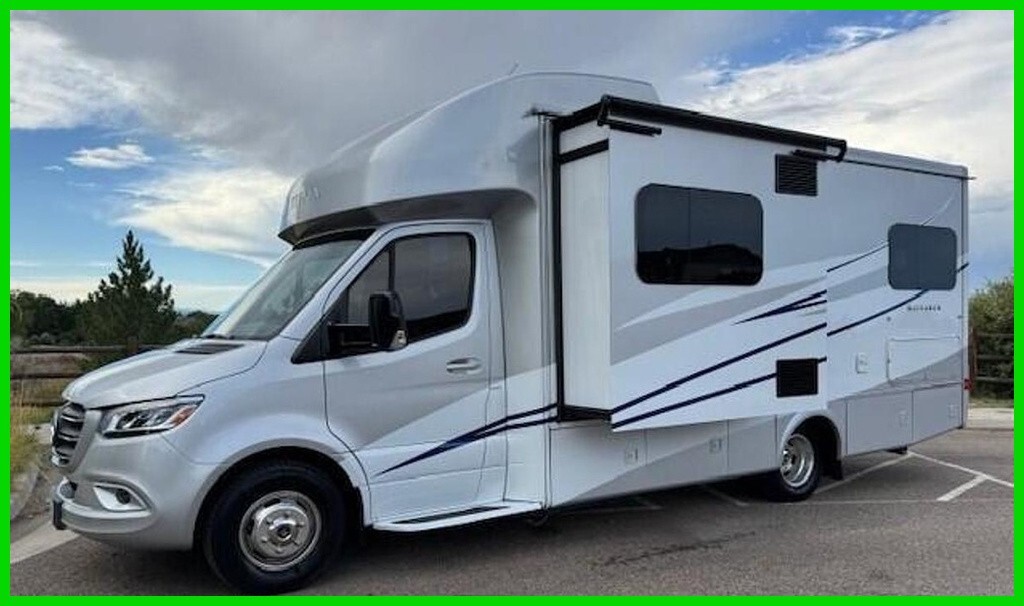 2022 Tiffin Wayfarer 25TW Class C Motorhome Upgraded suspension One-owner Wayfarer stored in a temperature-controlled garage, showing ~16,000 miles and covered by a transferable 5-year comprehensive warranty (through 02/2028). Built on the diesel Mercedes Sprinter 3500XD (approx. 15–17 MPG) with the coveted twin-to-king bedroom layout. Heavily upgraded ride and handling with rear Koni shocks, auxiliary Roadmaster rear sway bar (two sway bars total), and SumoSprings—dramatically reduces sway and wind wander. Features BigFoot automatic hydraulic leveling, living room slide, powered awning with speakers, on-demand Truma water heater, pass-through storage, exterior and bedroom TVs (three total including LR), opti