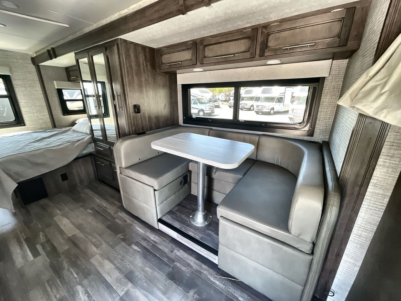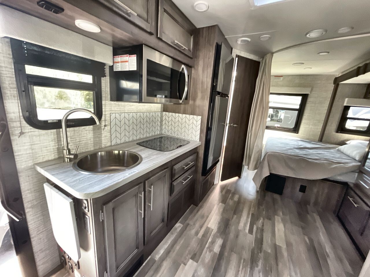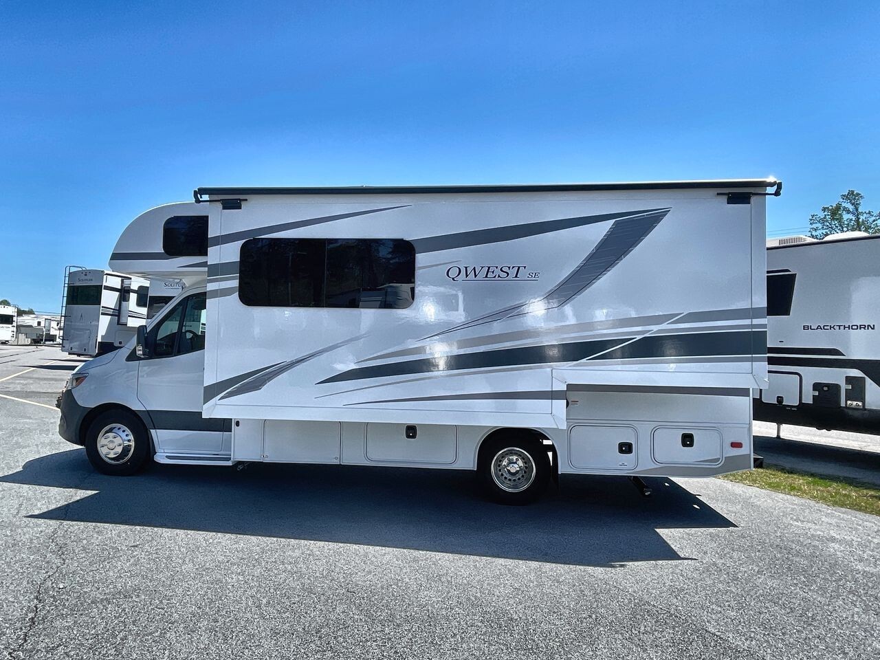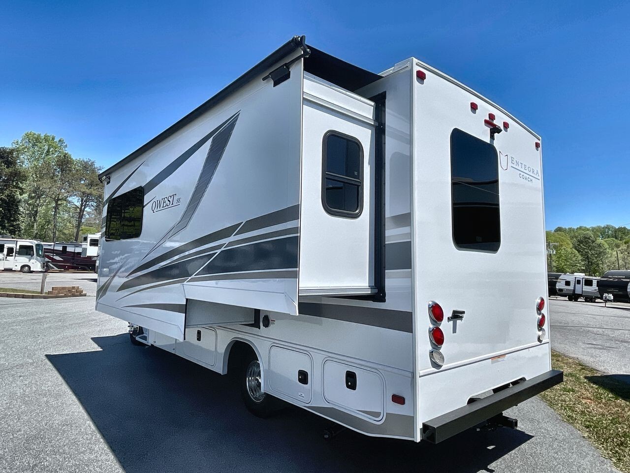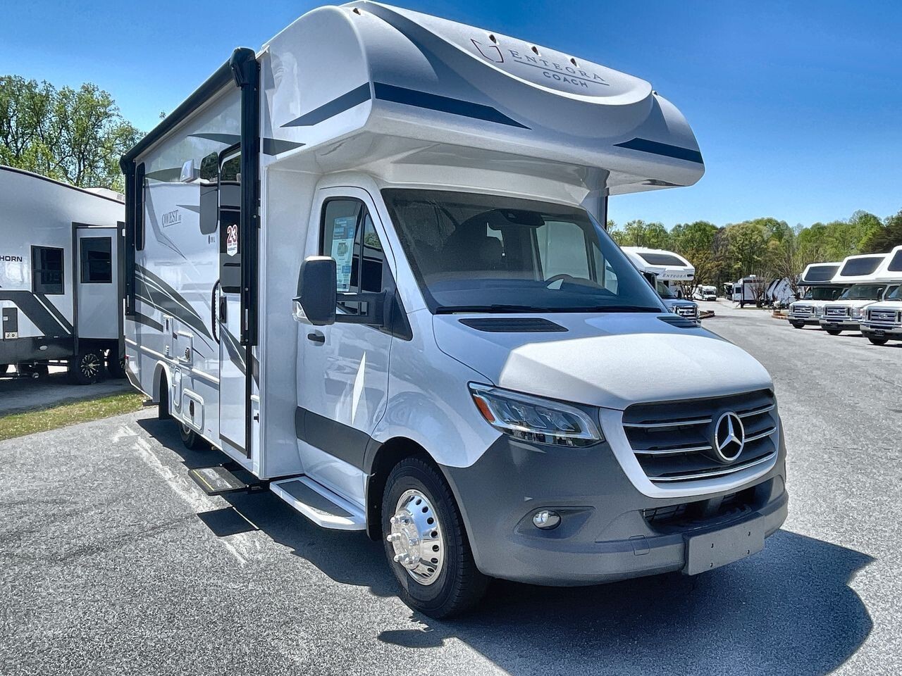 The 2024 Entegra Coach Qwest 24L is a luxurious and practical Class C motorhome designed for comfort and convenience. Built on the premium Mercedes-Benz® 3500 chassis with a 170-inch wheelbase, it offers a smooth and reliable driving experience. The 2.0L V4 Twin Turbo 211HP diesel engine, paired with a 9-speed automatic transmission, ensures efficient and powerful performance on the road.The exterior of the 24L features full-body paint options like Moonlight, Ozark, Sea Mist, and Sunrise, each available with a B+ front cap option. The one-piece, seamless fiberglass front cap includes an automotive-bonded panoramic window with a power shade, enhancing both aesthetics and functionality. The Girard® armless patio awning with an LED light strip provides a comfortable outdoor space, while frameless windows and heated, remote-controlled side-view mirrors add to the vehicle's convenience and safety features.Inside, the 24L