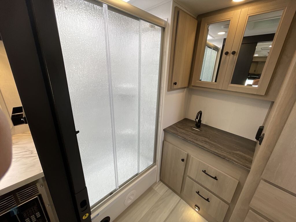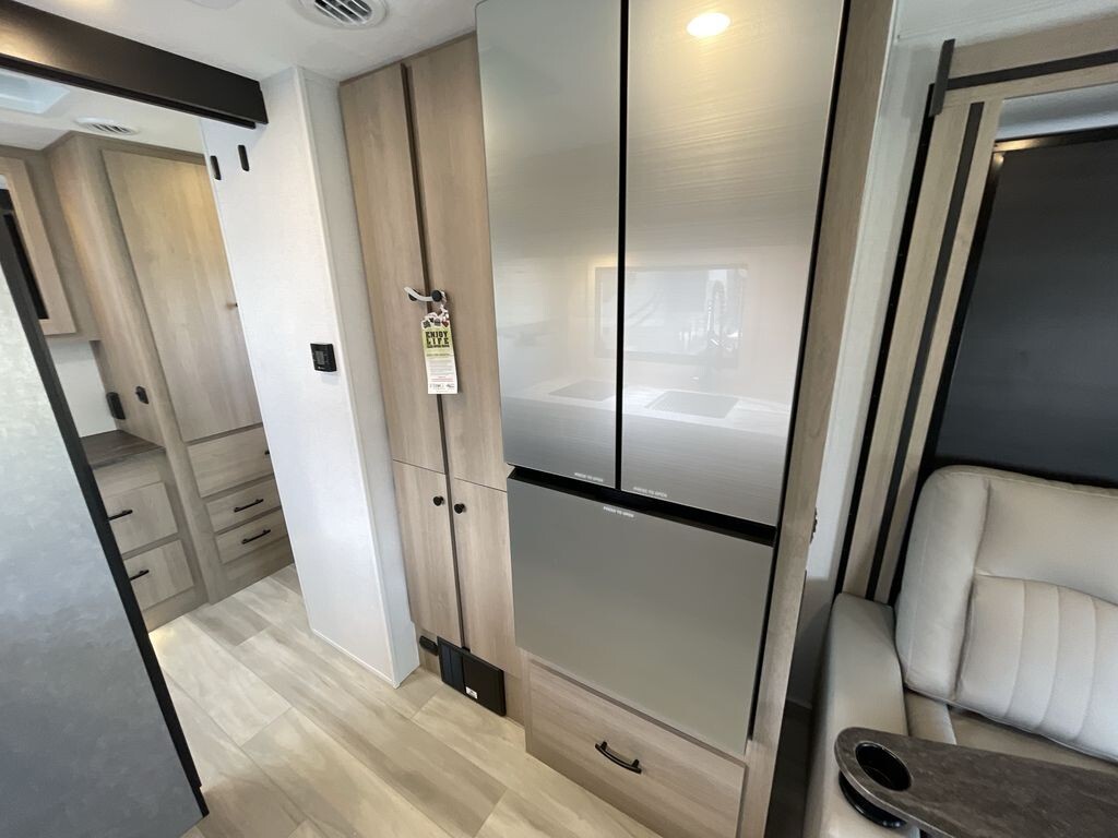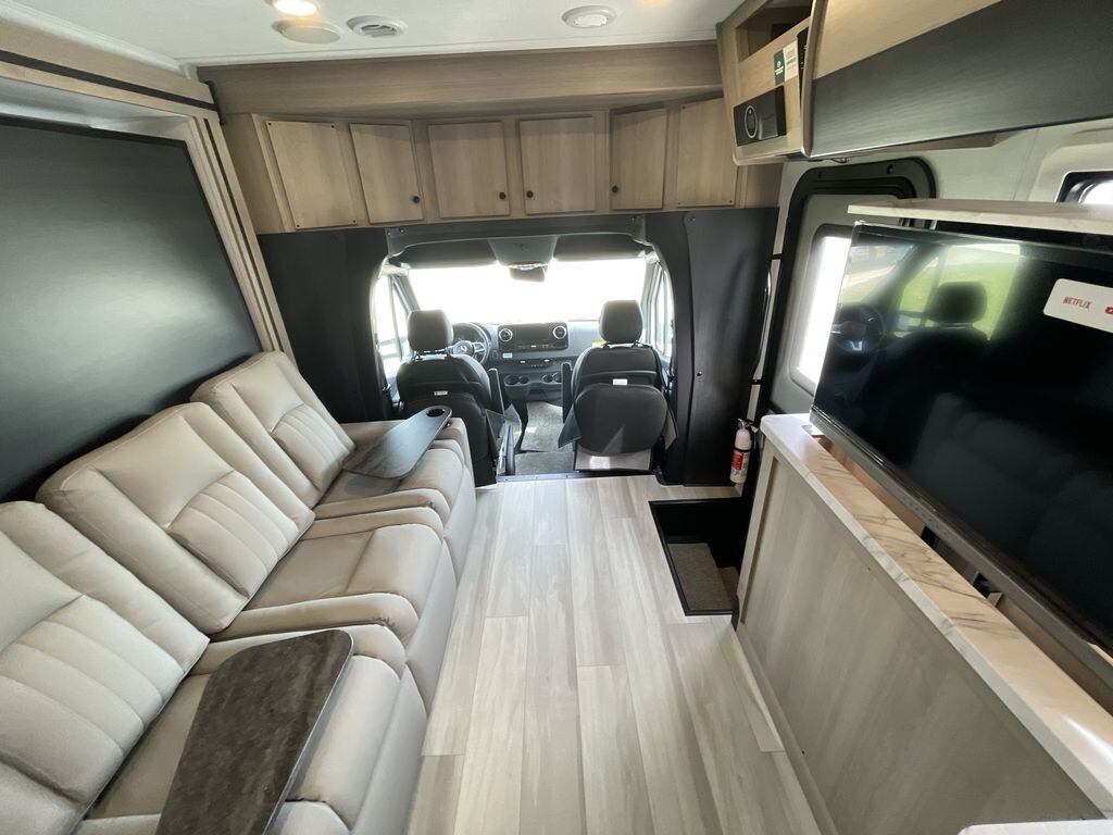 The 2025 Forest River Forester MBS 2401M is a versatile and comfortable Class C diesel motorhome, ideal for travelers seeking both convenience and luxury on the road. Built on the dependable Mercedes-Benz Sprinter 3500 chassis, it features a 3.0-liter V6 turbo diesel engine that delivers 188 horsepower and 325 lb-ft of torque, ensuring a smooth and efficient driving experience. Measuring 25 feet 4 inches in length, the 2401M is designed to maximize space and functionality. The interior boasts a smart layout with a full-wall slide-out, expanding the living area to provide ample room for relaxation. A comfortable double Murphy bed easily folds up to create additional seating during the day, enhancing the living space. The kitchen is well-equipped with a recessed two-burner range with a flush glass cover, a 1.3 cubic foot convection microwave, and a 10.7 cubic foot 12V refrigerator, making meal preparation straightforward. The