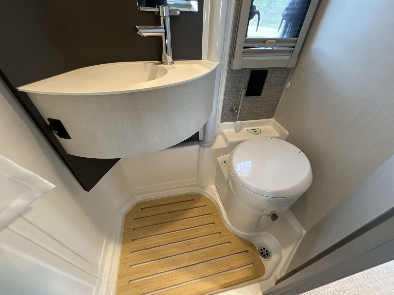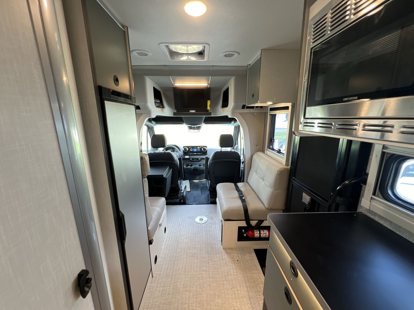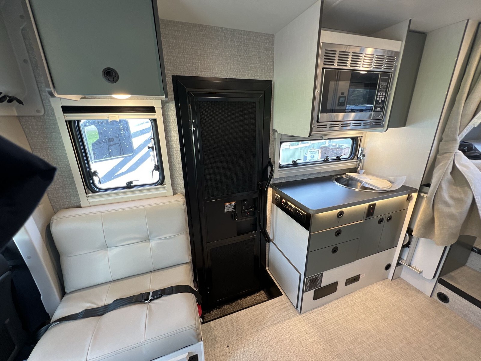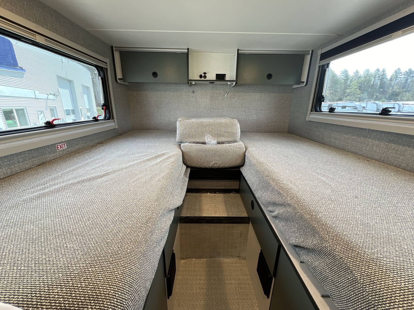 Inside, the Ekko 23B maximizes space with a rear multifunctional lounge that converts into different configurations, including twin beds measuring 32" x 80" that can combine into a queen-size bed. This setup accommodates up to four people comfortably.