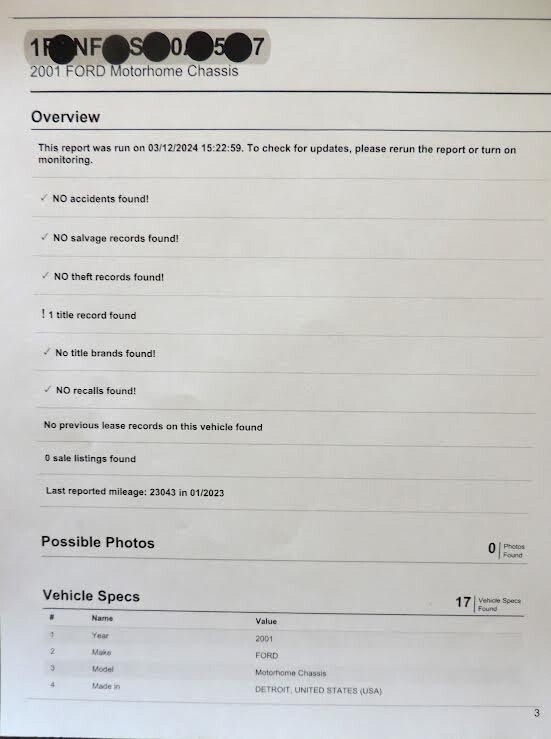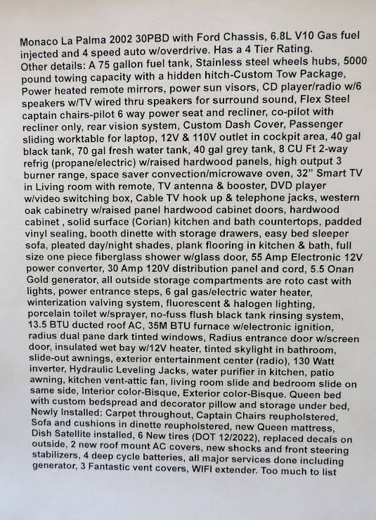 2002 Monaco La Palma 30PBD Looking for a motorhome that is ready to hit the road? Check out the 2002 Monaco La Palma with the 30PBD. This Class A Gas Motorhome has only 27,302 miles on it and comes with a clean title. The Ford Chassis and 6.8L V10 Engine make for a smooth and comfortable ride. The automatic 4-speed transmission with overdrive, power sun visors, and rear vision system ensure that driving is a breeze. Inside, you'll find a range of features to make your trip more comfortable and enjoyable. Enjoy music on the CD player/radio with 6 speakers, which are also wired to the TV for surround sound, a dish satellite with a wally remote. Relax in the Flex Steel Captain Cha