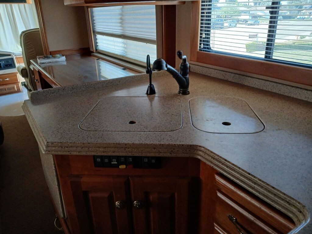 The well-appointed kitchen is designed for real cooking on the road, offering generous counter space, quality appliances, and plenty of storage. Whether you're preparing a quick breakfast before hitting the highway or cooking a full dinner at your favorite campground, this kitchen is built to handle it.