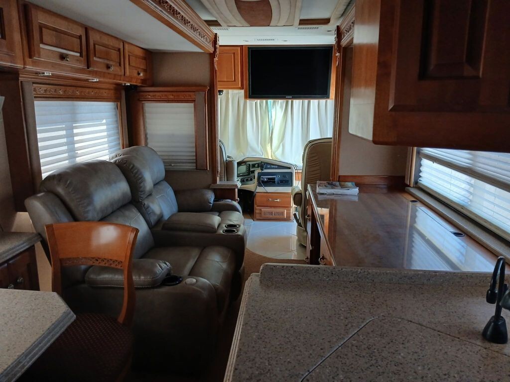 Inside, youre welcomed by rich hardwood cabinetry, polished solid-surface countertops, and elegant tile flooring that create a warm residential atmosphere. The expansive living area features plush seating, abundant lighting, and large panoramic windows that bring the outdoors in while creating a bright, comfortable space for relaxing or entertaining.