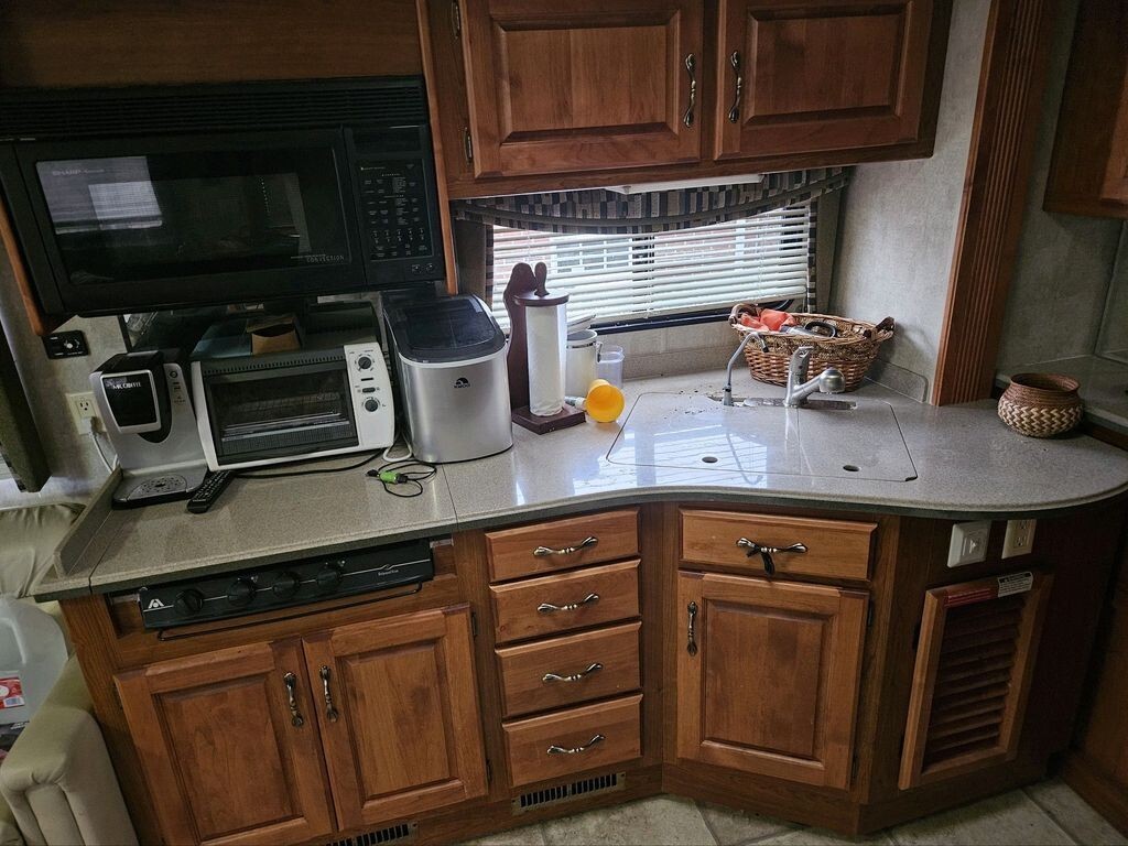 Step inside and take a look back at all of the convenient features that would make any journey enjoyable. The kitchen area features everything you need to prepare great meals on the go including a sink, a three burner range with microwave/convection oven, and a refrigerator/freezer. There is also plenty of storage for all of your dry and canned goods. Have a seat at the comfortable free standing dinette, where you can enjoy meals with your family.