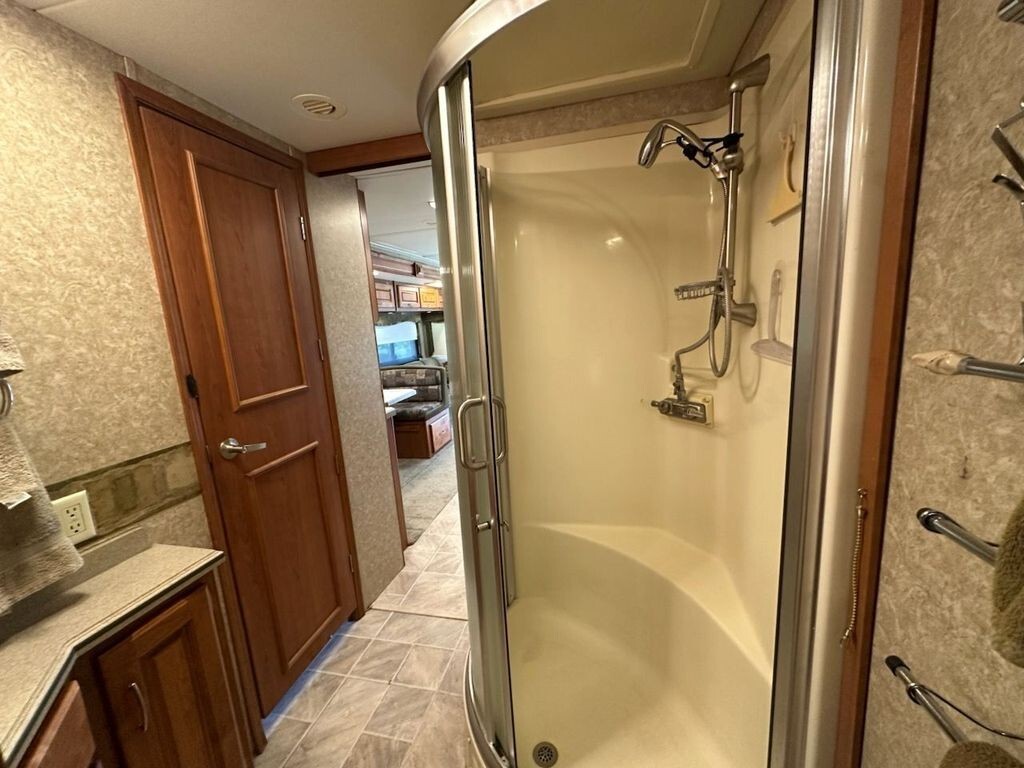Toward the rear, the private master suite offers a walk-around queen bed, generous wardrobe space, and abundant storage throughout. The spacious bathroom features a glass-enclosed shower, vanity with storage, and porcelain toilet, giving you all the comforts of home in a thoughtfully designed layout.