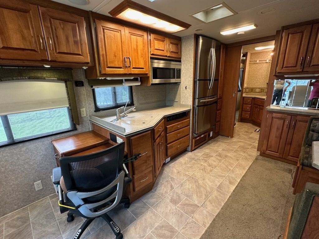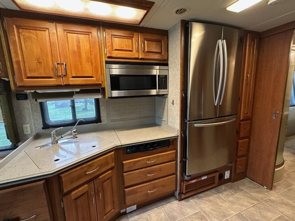 The well-equipped kitchen includes a three-burner cooktop, convection microwave, double-basin sink, a Samsung residential RF-18 refrigerator, and ample cabinet storage-perfect for preparing meals wherever your travels take you. A comfortable dinette provides a welcoming space for dining or gathering with guests.
