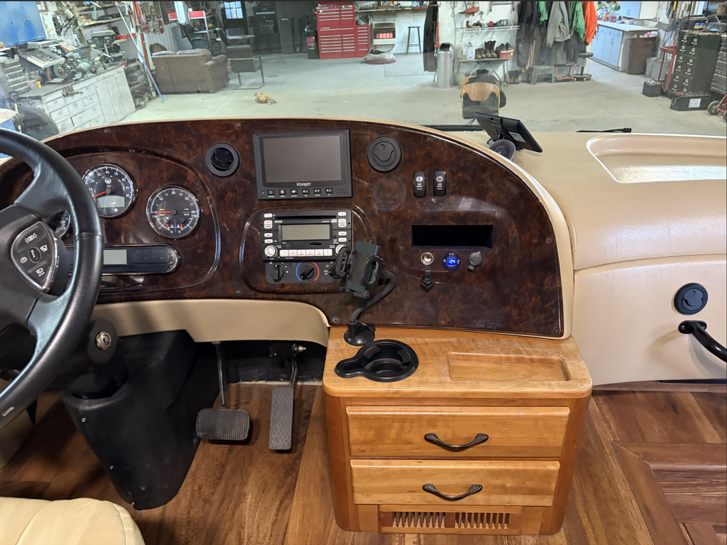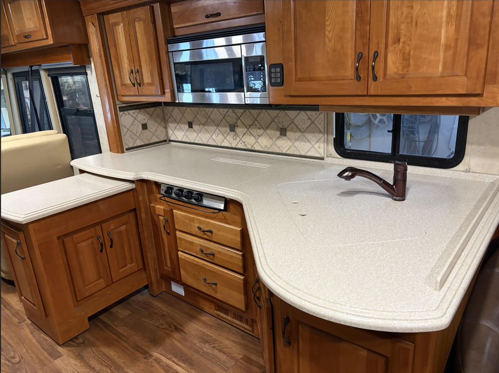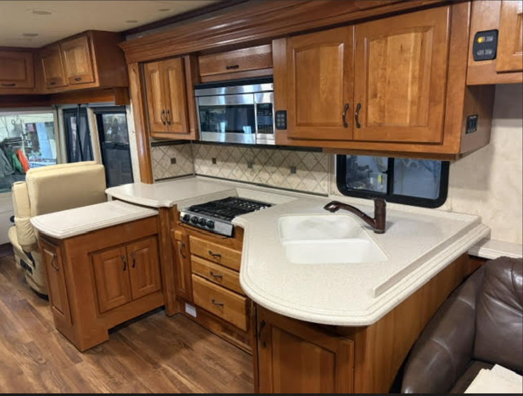 When off-grid, the robust 10,000-watt Onan generator provides ample, reliable power for all onboard systems, ensuring comfort wherever the road takes you. The coach rides confidently on new tires, adding peace of mind and value for the next owner.