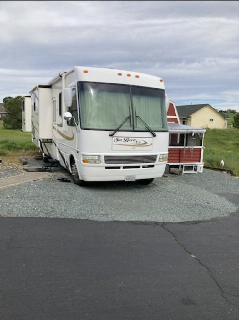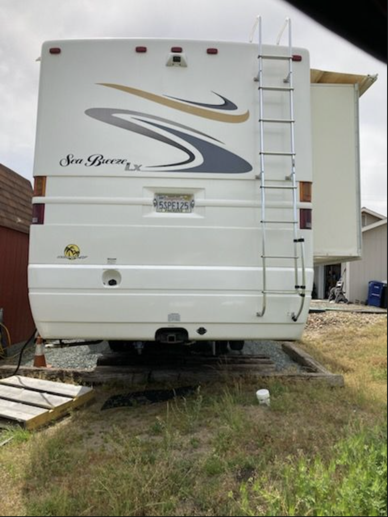 Entertainment features include three TVs (living room, bedroom, and exterior), cable and satellite hookups, a radio system, and a backup camera to assist when maneuvering.