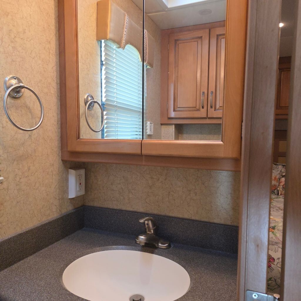 Comfort is assured year-round with dual rooftop A/C units and premium hydronic heating. The mid-coach bath offers residential convenience with a glass-enclosed shower, vanity, medicine cabinet, and private toilet area.