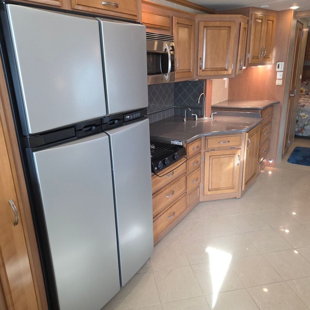 Inside, the living area is warm and inviting with a sofa sleeper and booth dinette (both convert to beds), making it ideal for couples or guests. The fully equipped kitchen features solid-surface countertops, a three-burner cooktop, convection microwave, dual porcelain sink, and a large four-door refrigeratorperfect for extended travel or full-time living.