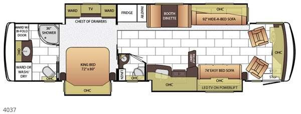 The half bath is down the hall. The rear bedroom has a king bed slide. The master bath offers a toilet, sink, wardrobe, and corner shower. There is a full wall slide with two wardrobes, a chest of drawers, overhead TV, pantry, refrigerator, booth dinette, and hide-a-bed sofa.
