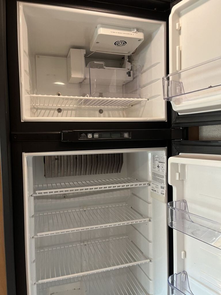 Three-burner cooktop, oven, microwave, and large refrigerator