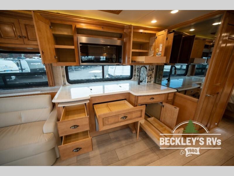 Full and Half Bath Dual-Sink Vanity Hide-A-Leaf Dinette Pull-Out Cabinet Pantry Pillowtop King BedLuxury is waiting for you in this spacious Dutch Star Class A diesel motorhome that can comfortably sleep six each night. The full-wall slide plus two additional slides will open up the whole unit for a more at-home feel. Relax on the hide-a-bed sofaor read a book on the jackknife sofa. The passenger workstation or hide-a-leaf dinette will be the perfect place to catch up on some work while you're away from home. Easily prepare breakfast, lunch, and dinner on the three-burner recessed gas cooktop, or use the convenient stainless steel convection microwave. This model features a master suite with a pillowtop king bed, dual wardrobes and a dresser, plus an LED TV. You will love the rear bath cathedral ceiling that will add additional height, plus there is plenty of storage space and two bath sinks so that you and your spouse can freshen up at once!