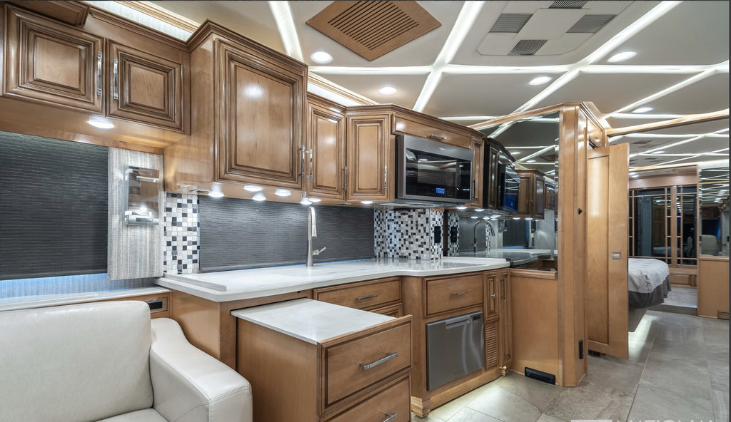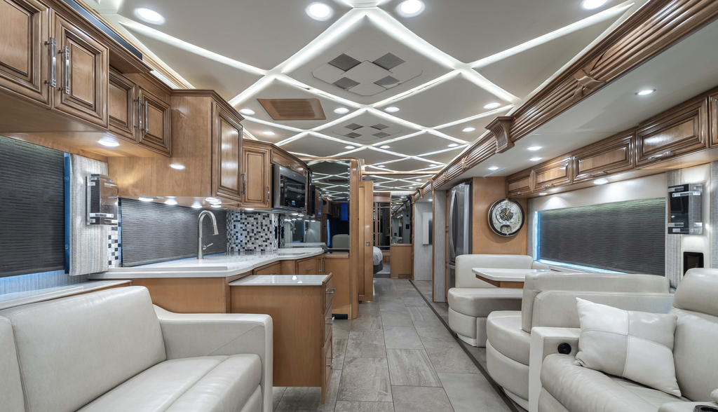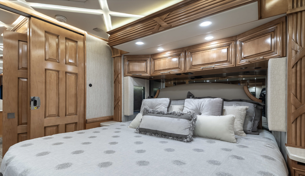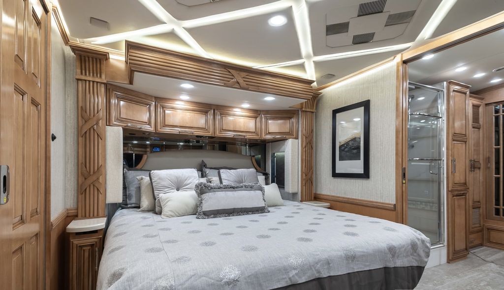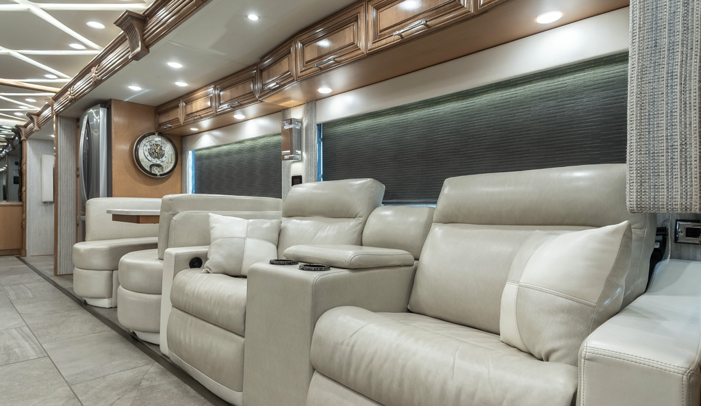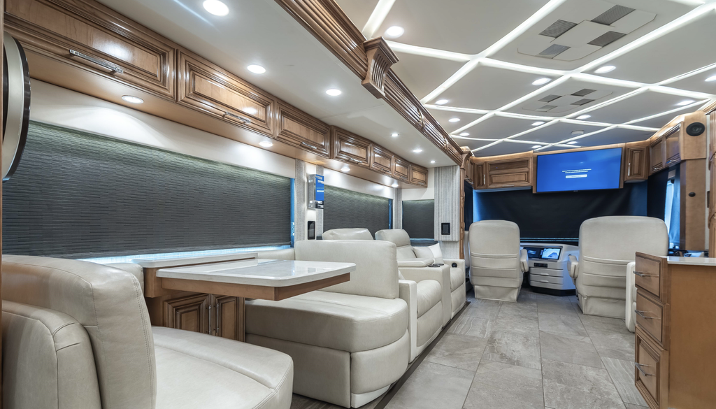 Relax in a beautifully appointed living area with power-reclining theater seating, a Bose® surround sound system, and large Samsung 4K TVsfour TVs total, all Dish-ready. Whether entertaining guests or enjoying a quiet evening, this coach delivers a premium home-theater experience on the road.