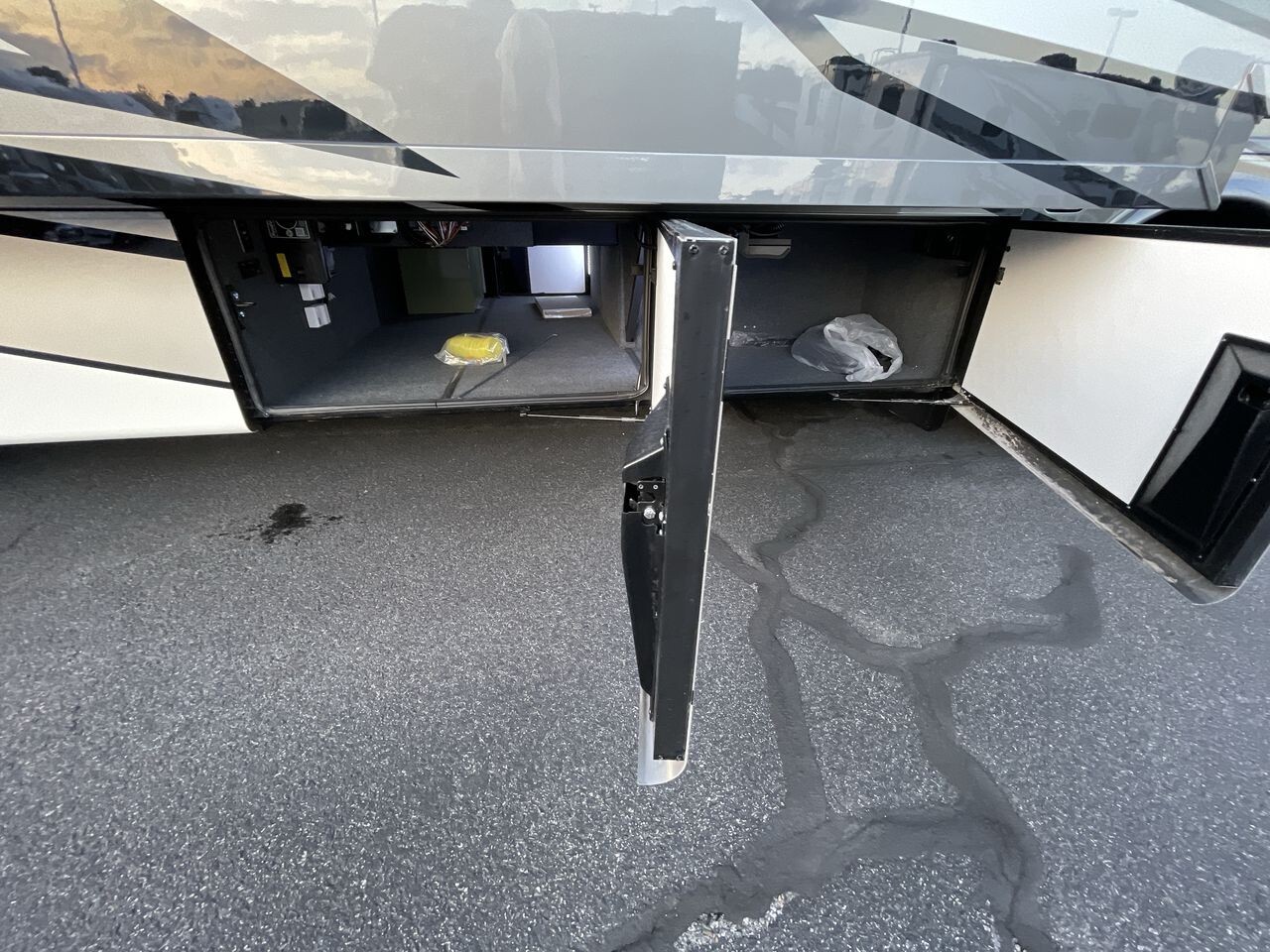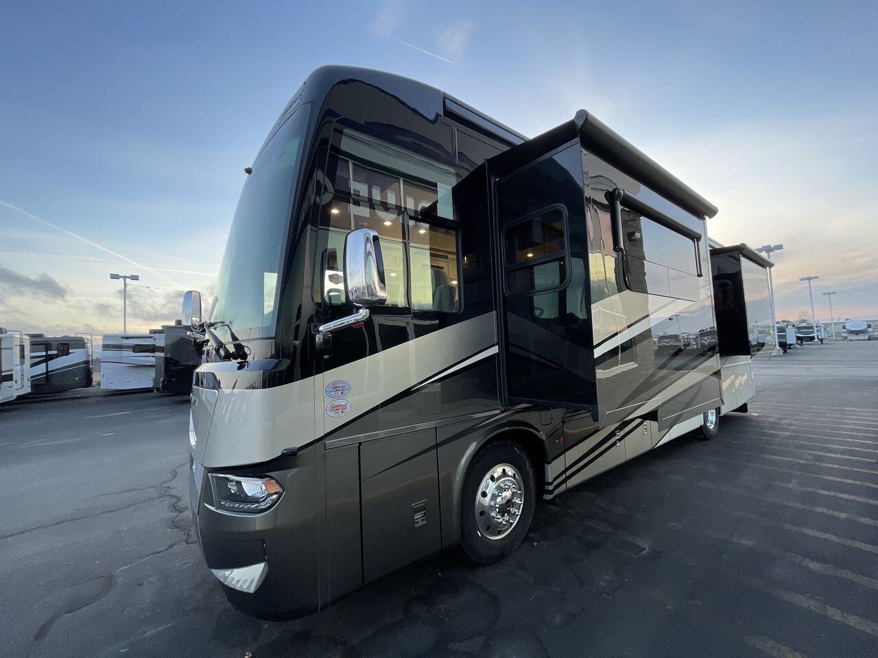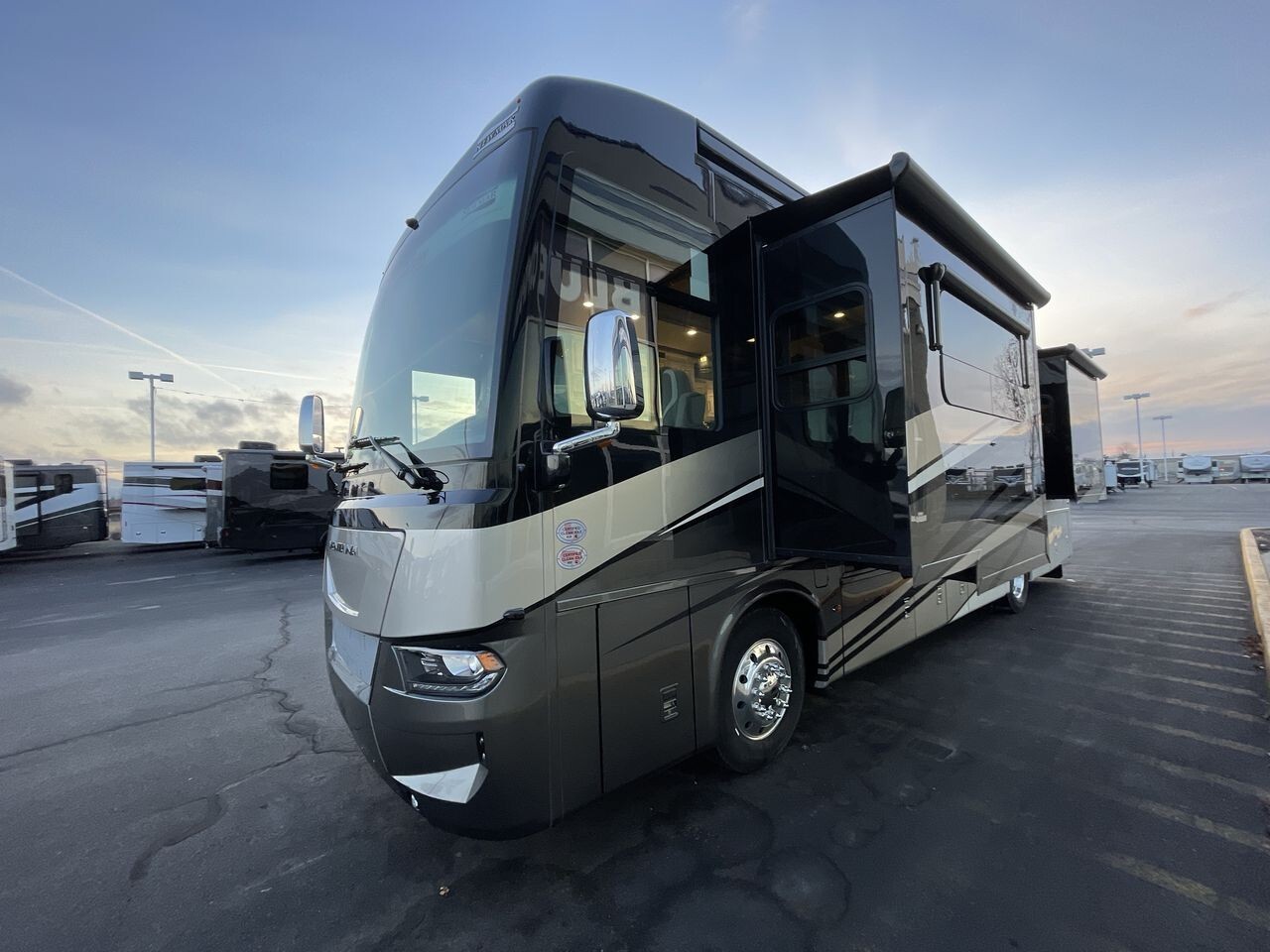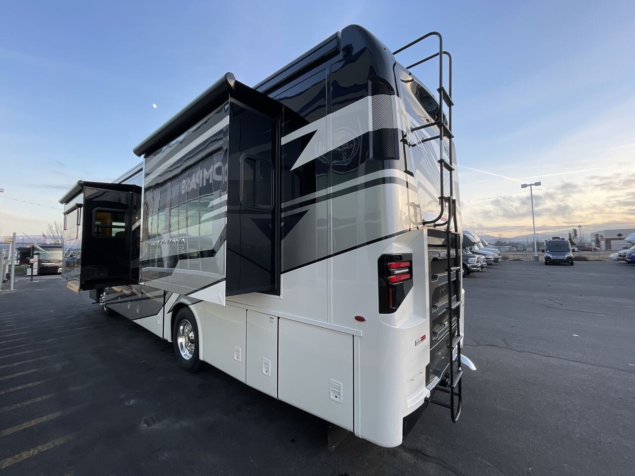 Measuring approximately 35.83 feet in length, 8.46 feet in width, and 12.83 feet in height, the Ventana 3512 offers a spacious interior with an 83-inch ceiling height. The exterior features a full-paint masterpiece finish, providing a modern appearance that stands up to the elements. Four power-retractable slideouts expand the living space, while a power-retractable awning offers shade and protection outdoors. Ample pass-through storage compartments accommodate all your travel essentials.