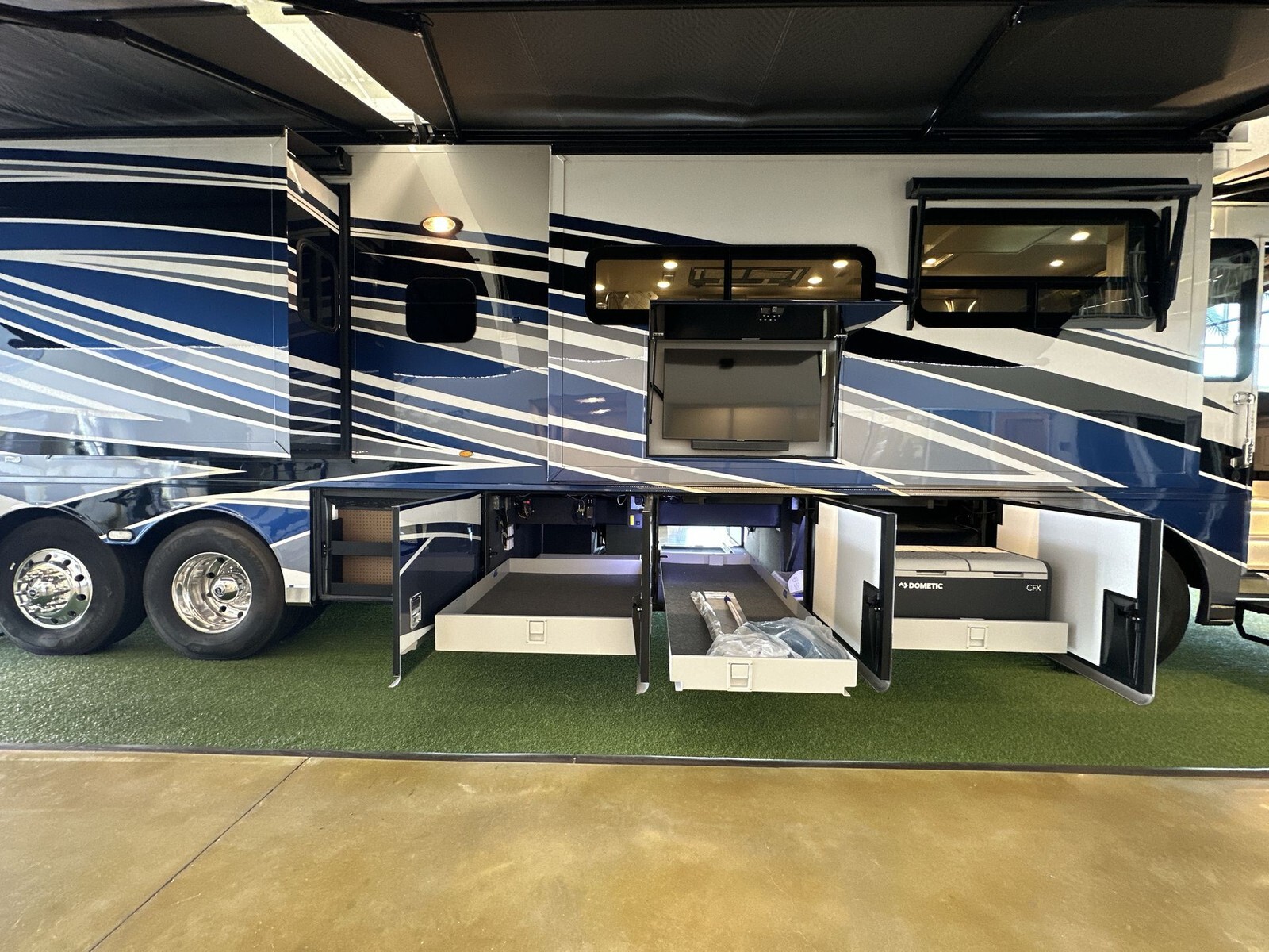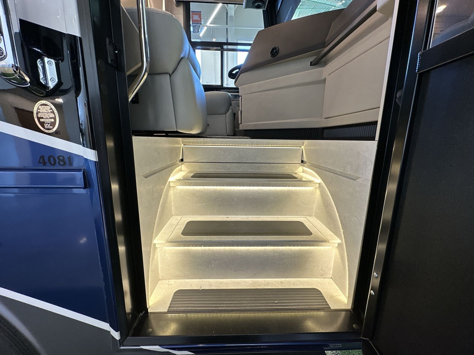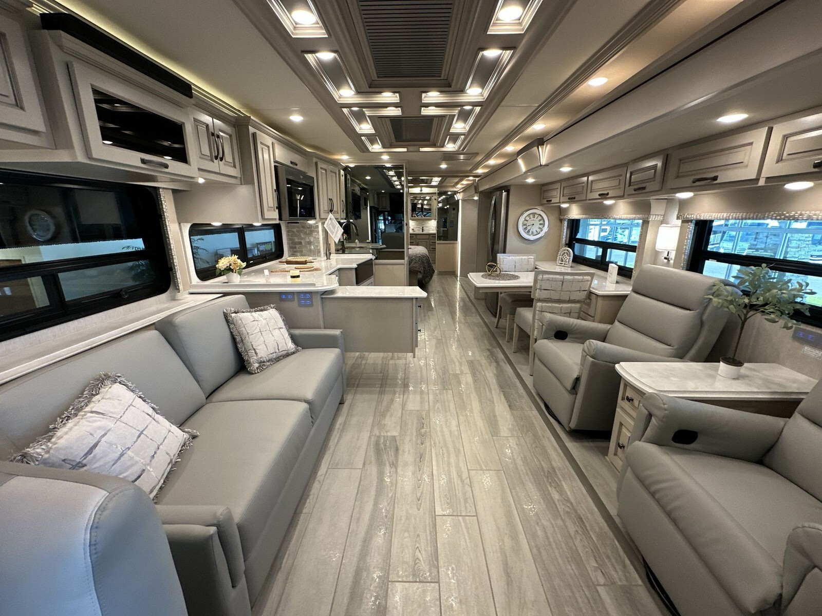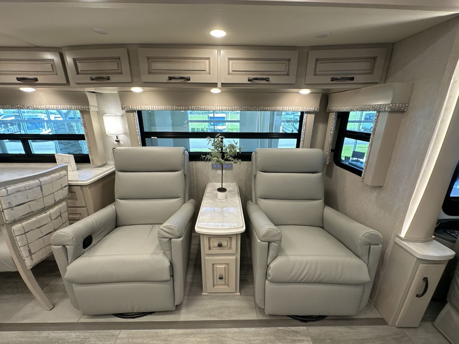 Inside, the 4081 features a spacious and thoughtfully designed living area with plush leather seating, including two sofas and optional recliners, perfect for relaxation. The open floor plan allows easy movement throughout the RV, creating a welcoming atmosphere.