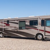 Inside, the 4340 boasts a spacious floor plan with three slide-outs that expand the living area. The interior features high-quality finishes such as solid-surface countertops, polished porcelain tile flooring, and hardwood cabinetry. The living area includes comfortable seating, a retractable 50-inch LED TV, and a premium sound system for entertainment.