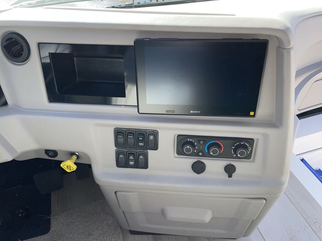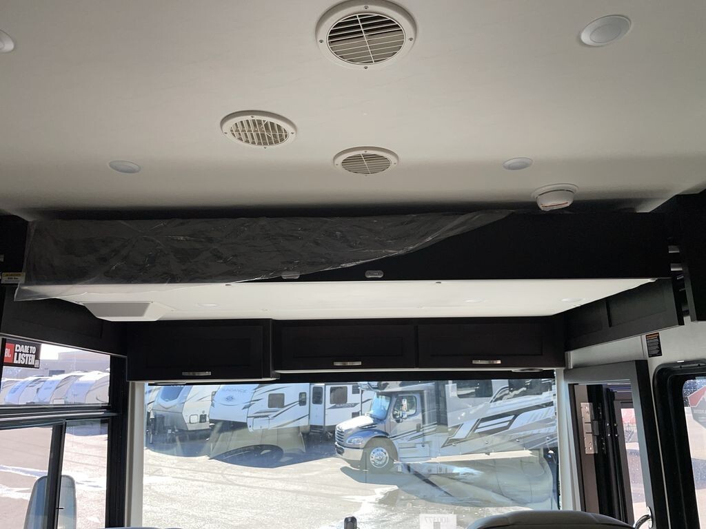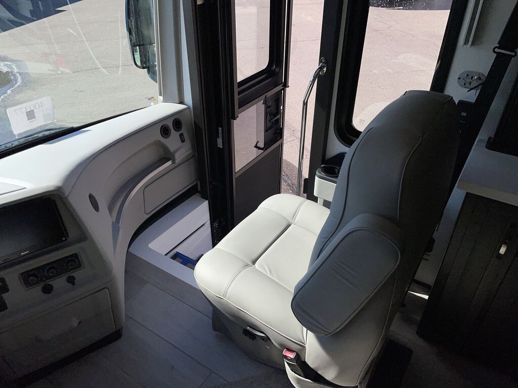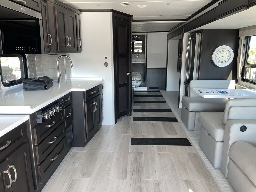 Measuring approximately 37.83 feet in length, the 3709 offers a spacious interior with a thoughtfully designed floor plan. The living area features plush seating, including theater seats and a dinette, perfect for relaxation and entertainment. A Samsung LED TV on a power lift enhances your viewing experience.