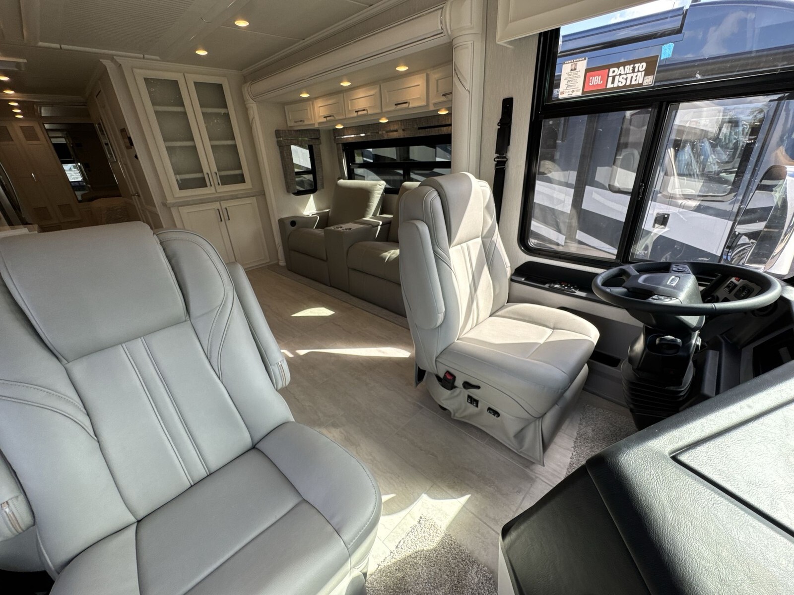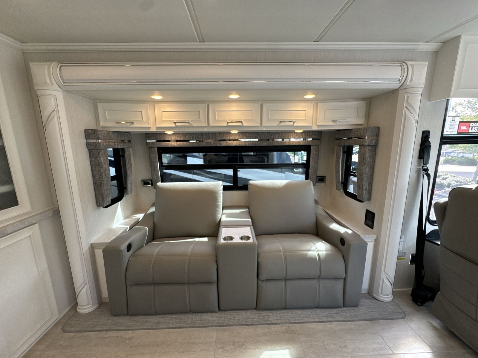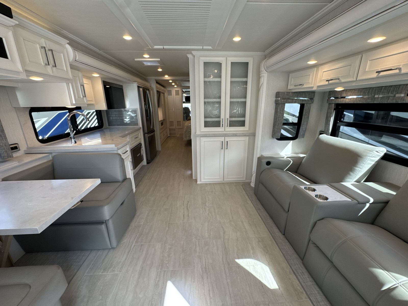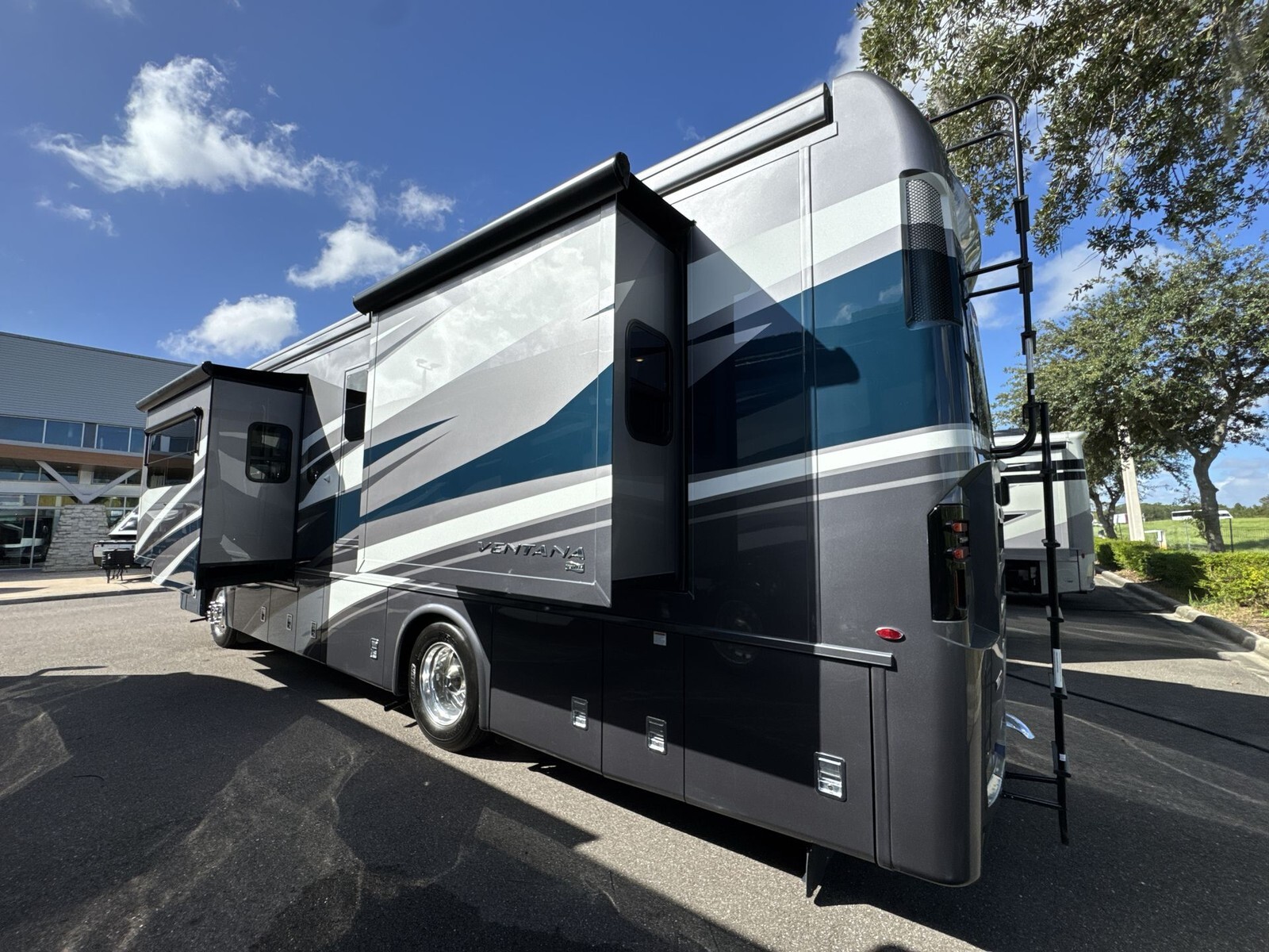 Measuring approximately 35.83 feet in length, 8.46 feet in width, and 12.83 feet in height, the Ventana 3512 offers a spacious interior with an 83-inch ceiling height. The exterior features a full-paint masterpiece finish, providing a modern appearance that stands up to the elements. Four power-retractable slideouts expand the living space, while a power-retractable awning offers shade and protection outdoors. Ample pass-through storage compartments accommodate all your travel essentials.