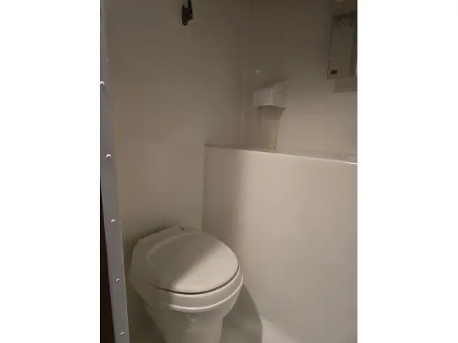 Bathroom: Rear Wet Bath with Shower, Curtain, Plastic Toilet, Medicine Cabinet, And Fan