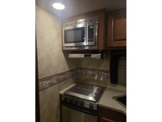 Kitchen: 3-Burner Range with Oven, Microwave, Mid-Size Electric/Propane Refrigerator, Double Sink, And Overhead Fan