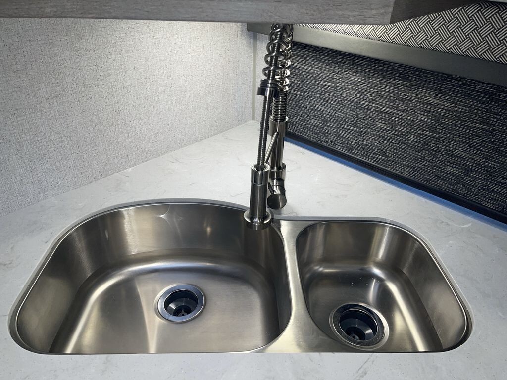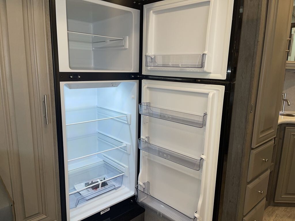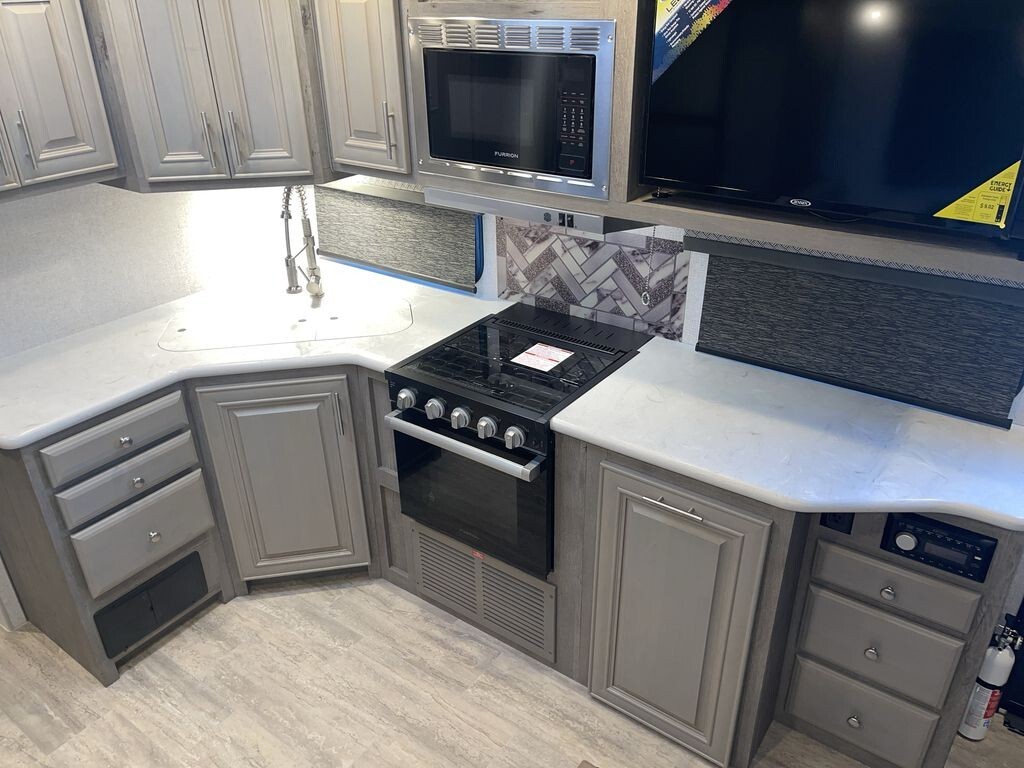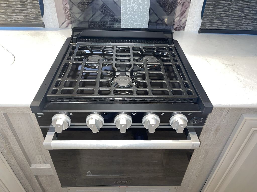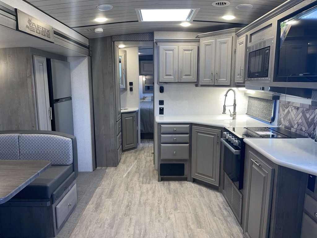 Inside, the 27SX boasts a spacious layout with plush seating and large panoramic windows that fill the space with natural light. The kitchen is equipped with modern appliances, including a three-burner stove, microwave, and a full-size