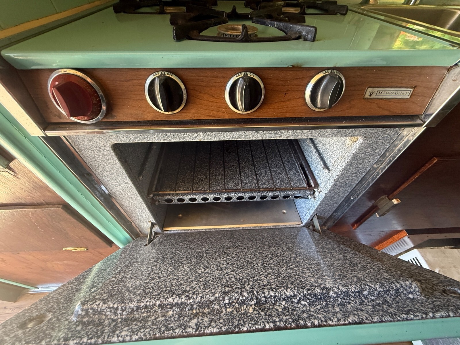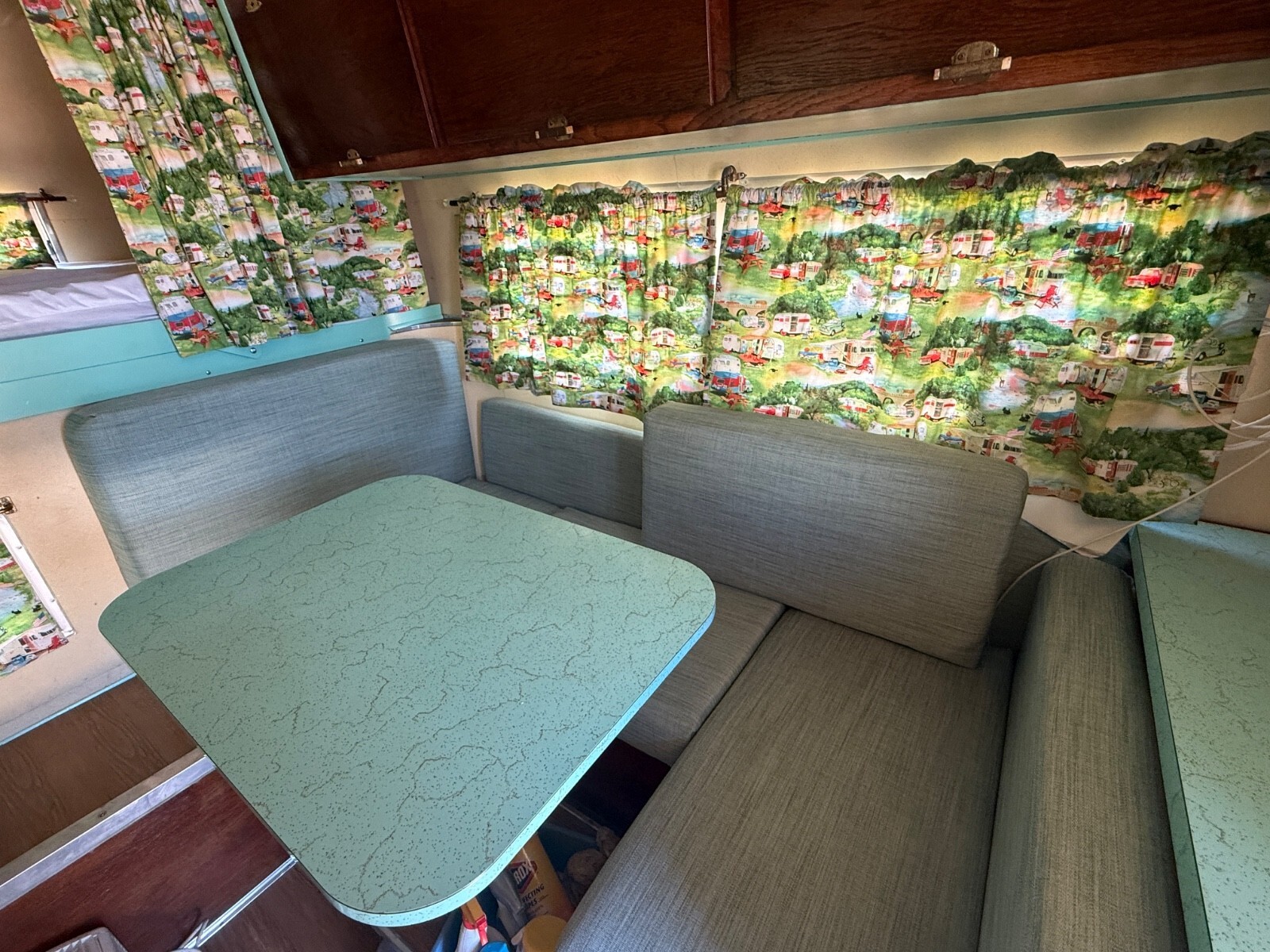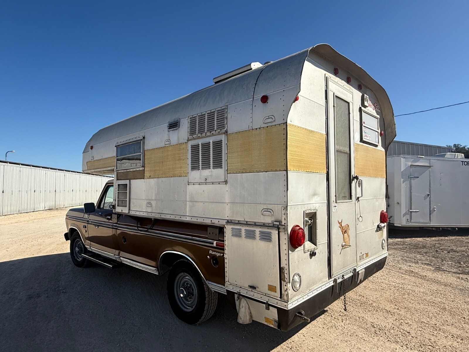 I love the original Deer and Road Running decals from the 1960’s still on it. The Camper body is nice too. Absolutely NO big dents, drags or corner crunches. The camper has four new lift jacks and two large very well built wheeled dollies that once camper is jacked off the truck, you roll them under the camper to make safe and secure.