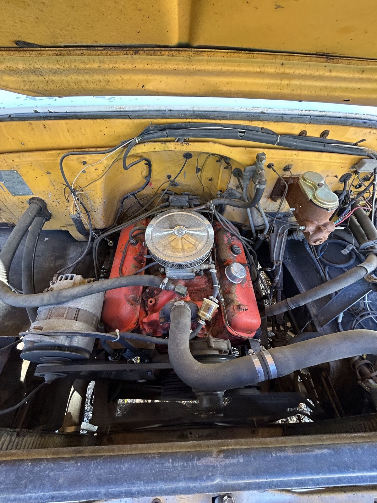 a recently rebuilt Chevy 427 big block V8 with new distributor, fuel pump, alternator, starter, water pump, 100 Amp alternator and fresh exhaust from the engine back. 4spd manual transmission with two speed rear end. The bus drives and the motor starts and runs very well. This is not a cross country adventure rig as it sits currently, would need new tires and shocks in the rear to drive long distances. For the right price I may be interested in including both these upgrades, but would prefer a cash local deal or a trade of a vehicle of equal value.