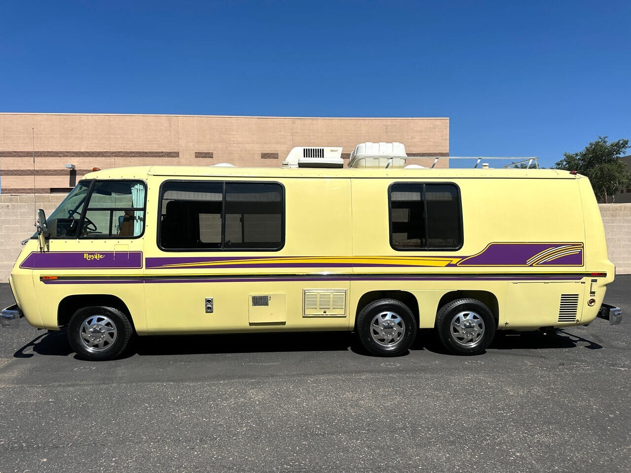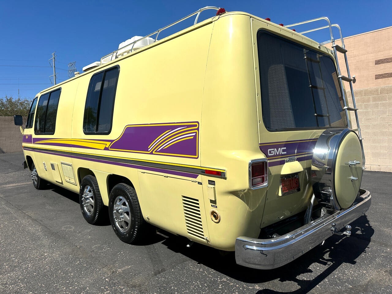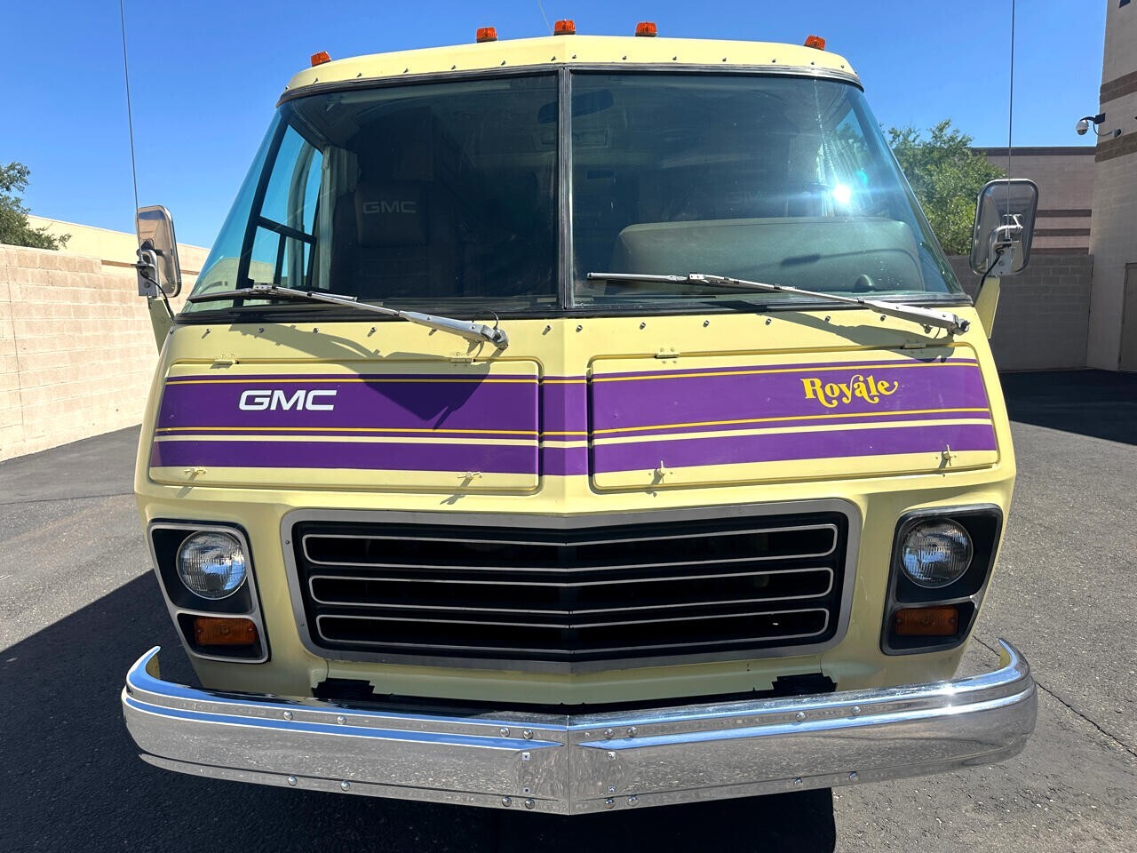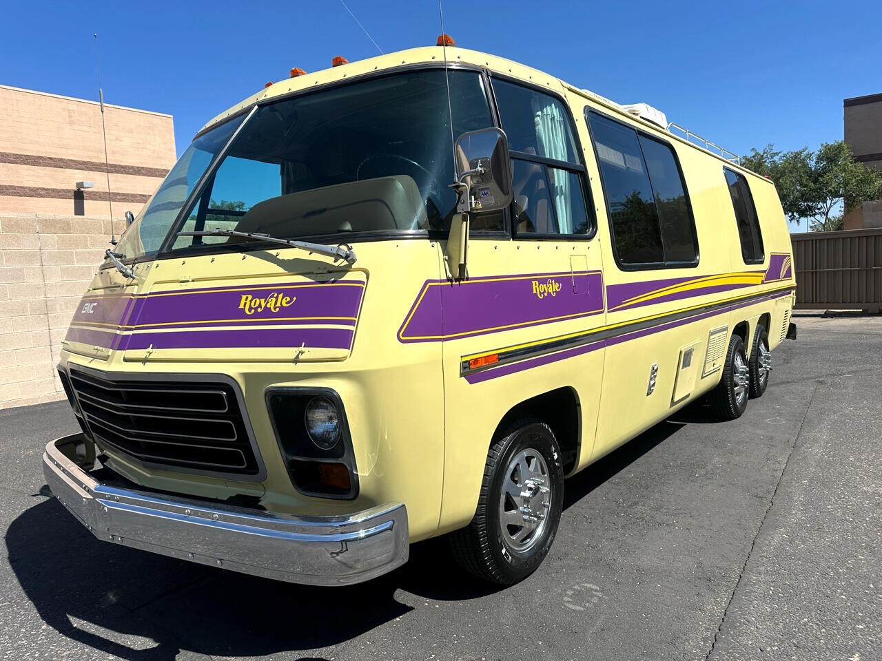 This 1977 GMC Jimmy Coachman Royale motorhome is a 3 owner Motorhome. Finished in yellow with purple graphics, the RV is powered by a 403ci V8 mated to a Turbo-Hydramatic three-speed automatic transaxle. The interior features a dining area, two convertible couches, and a lavatory. The kitchenette is equipped with a refrigerator, sink, an oven and stove, and multiple wood storage cabinets. Additional features include 16 alloy wheels, a fold-out awning, chrome bumpers, a rear ladder, a side-entry door, sliding windows with screens, an Onan generator, central heating and air conditioning, power-operated suspension leveling, and a Delco AM/FM push-button stereo. Work performed during ownership is to include fluid flushes, a recharge to the air conditioning system, and replacement of the interior flooring.This motorhome is now offered with the manufacturers literature, original sales documents, and a clean Arizona title in the