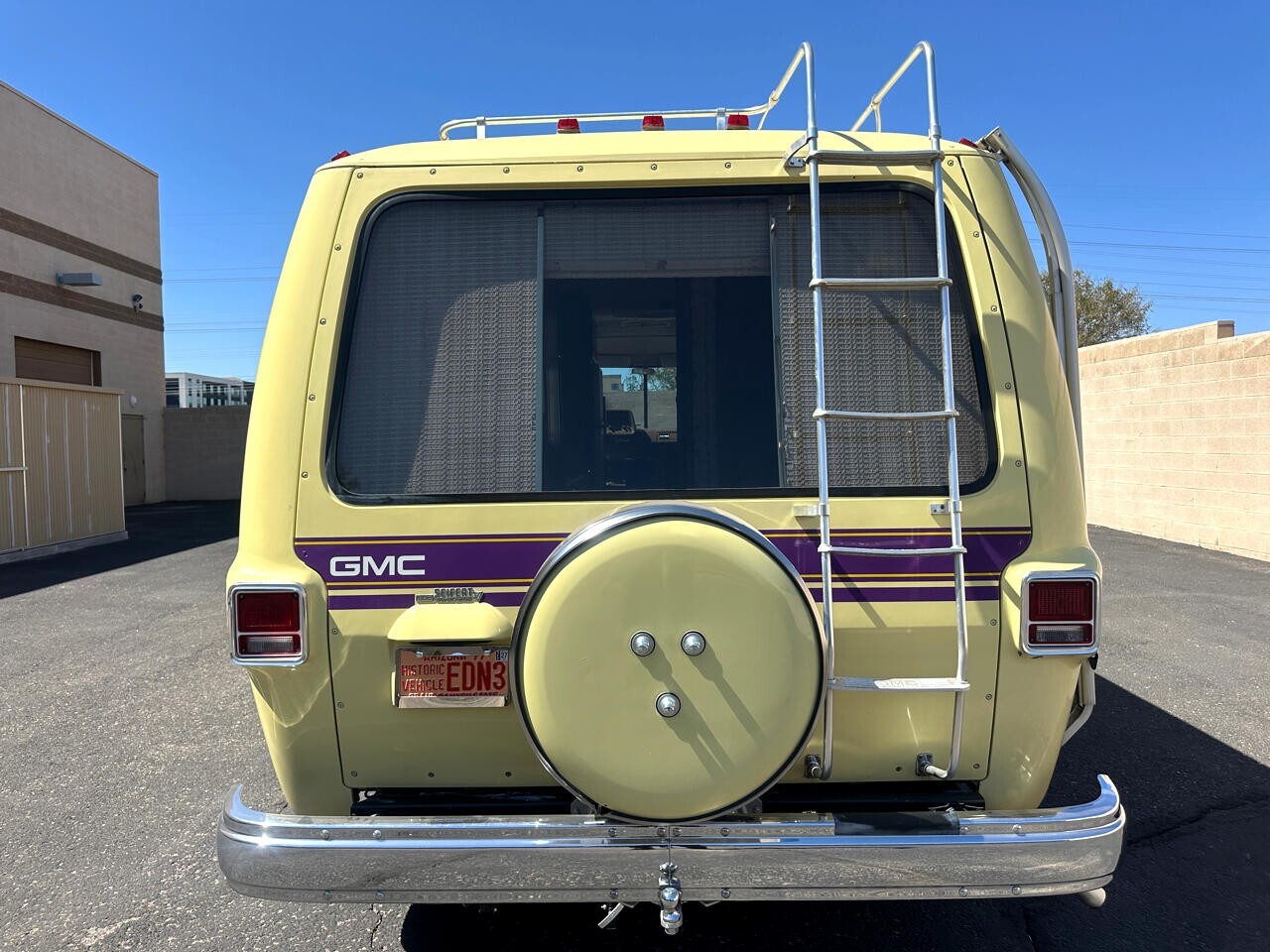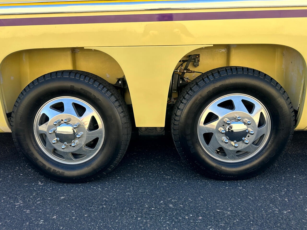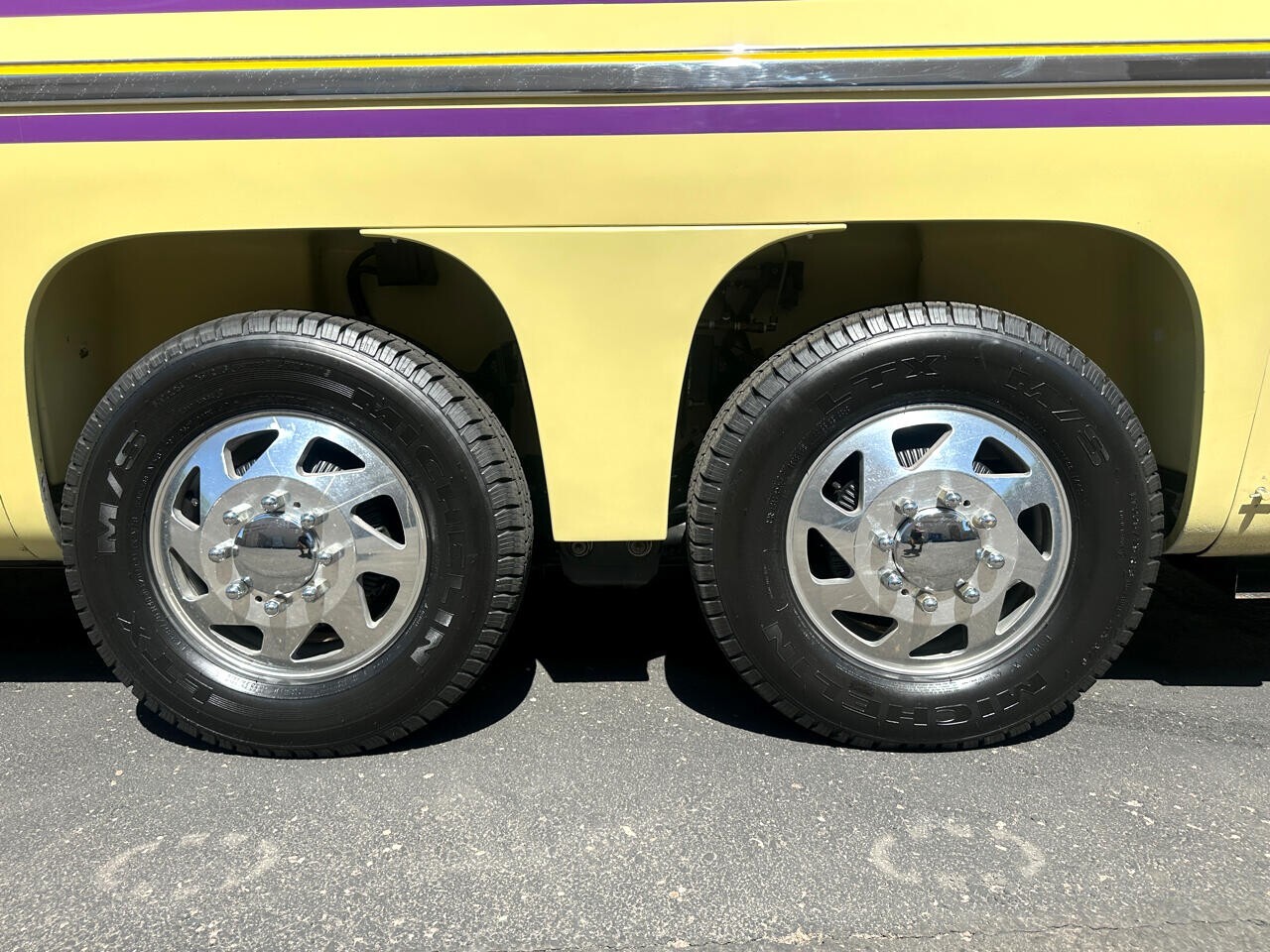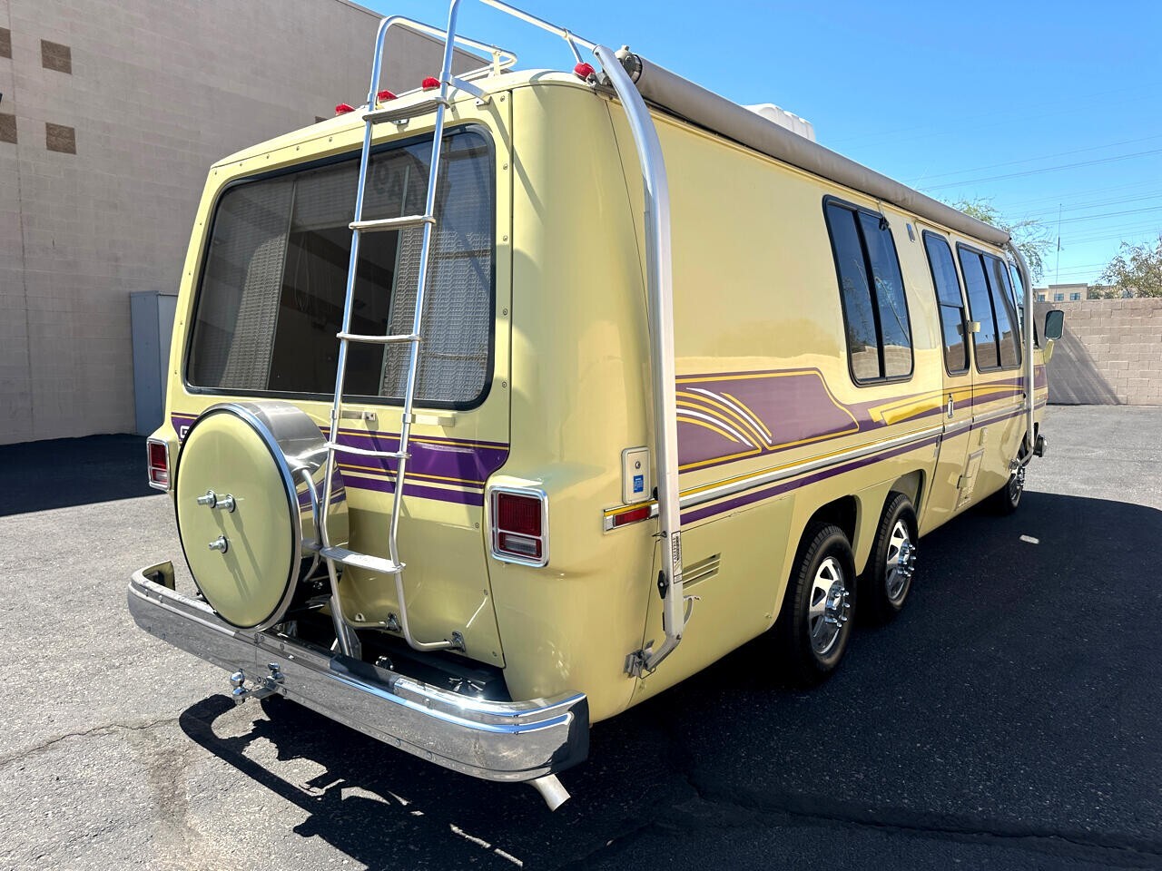 This 1977 GMC Jimmy Coachman Royale motorhome is a 3 owner Motorhome. Finished in yellow with purple graphics, the RV is powered by a 403ci V8 mated to a Turbo-Hydramatic three-speed automatic transaxle. The interior features a dining area, two convertible couches, and a lavatory. The kitchenette is equipped with a refrigerator, sink, an oven and stove, and multiple wood storage cabinets. Additional features include 16 alloy wheels, a fold-out awning, chrome bumpers, a rear ladder, a side-entry door, sliding windows with screens, an Onan generator, central heating and air conditioning, power-operated suspension leveling, and a Delco AM/FM push-button stereo. Work performed during ownership is to include fluid flushes, a recharge to the air conditioning system, and replacement of the interior flooring.This motorhome is now offered with the manufacturers literature, original sales documents, and a clean Arizona title in the