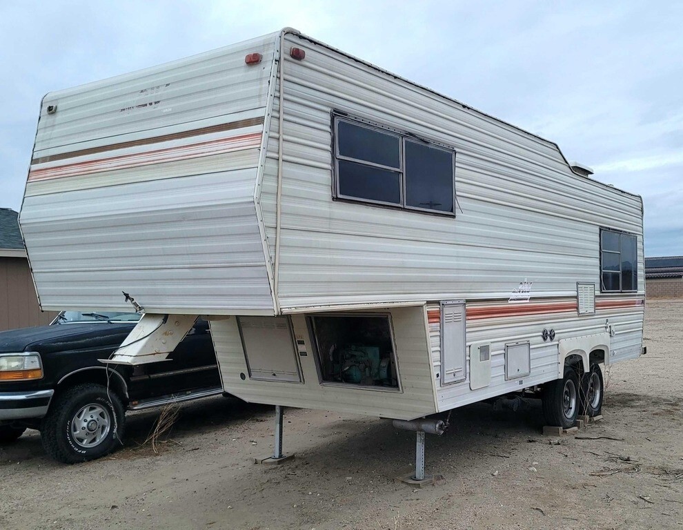This 1985 Aljo Aly CCH Fifth Wheel is a solid, well-kept trailer that has been in storage and has good structural components and a functional generator.