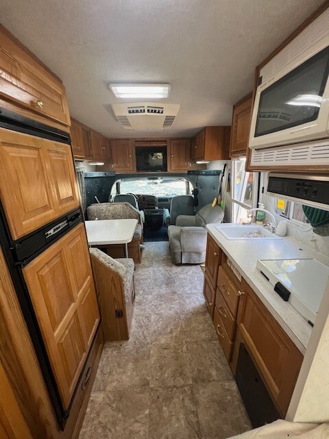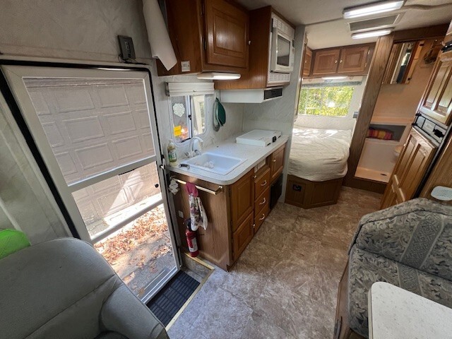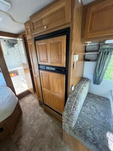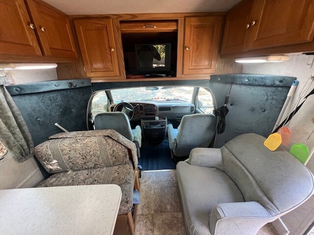 Storage is integrated throughout with overhead cabinets, wardrobe space, and two exterior compartments for camping gear or supplies. The unit is known for its quality construction, with a fiberglass exterior and rubberized roof. Mostly oak cabinets, they don’t make them like this anymore.
